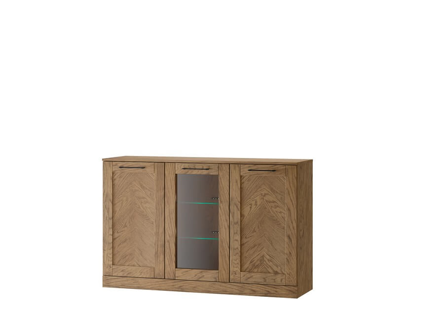 Komoda 3-drzwiowa z oświetleniem Cozy 45 zapewni dodatkowe miejsce do wykorzystania, idealna do pokoju dziennego czy sypialni. Komoda w kolorystyce naturalnego drewna dębowego z oświetleniem przestrzeni oszkolonych, będzie ozdobą każdego wnętrza. Na przeszklonych półkach doskonale będą prezentowały się eleganckie dodatki i pamiątki.