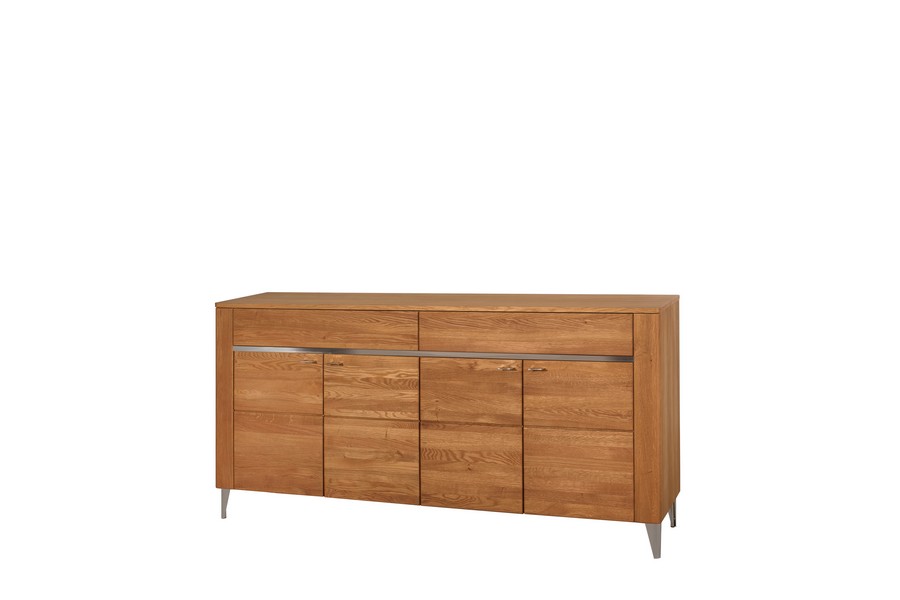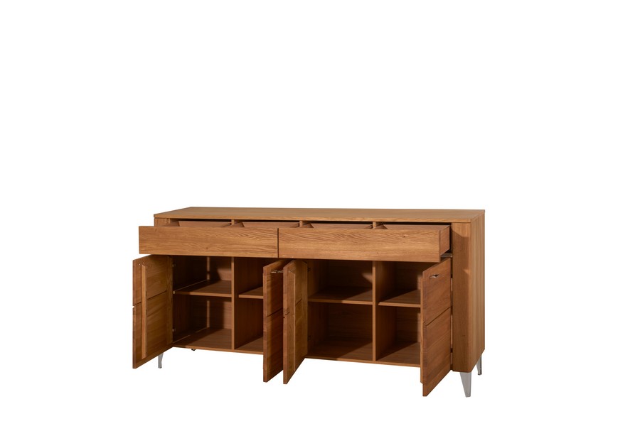 Komoda 4-drzwiowa z dwoma szufladami Latina 45 łączy w sobie elegancję i funkcjonalność. Chromowane ramki, metalowe nóżki i srebrne uchwyty to elementy, które doskonale wydobywają naturalne piękno drewna.