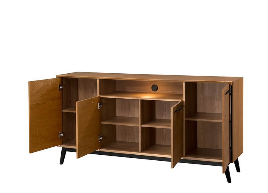 Komoda 4-drzwiowa z oświetleniem z kolekcji Lazure to elegancki i praktyczny dodatek do nowoczesnych wnętrz, wprowadzający ciepły odcień karmelowego dębu rustical. Jej solidna szerokość 180 cm, wysokość 90 cm i głębokość 42 cm zapewniają dużą przestrzeń do przechowywania przy zachowaniu smukłej, poziomej formy.
