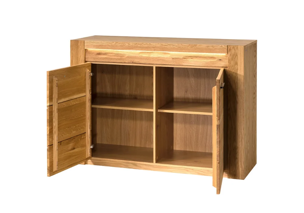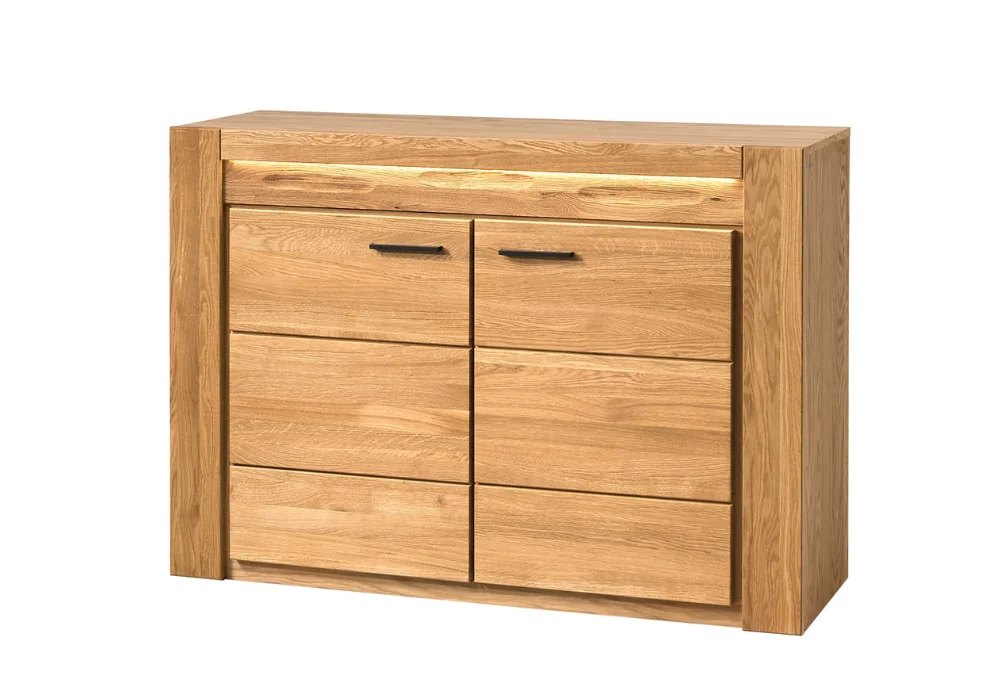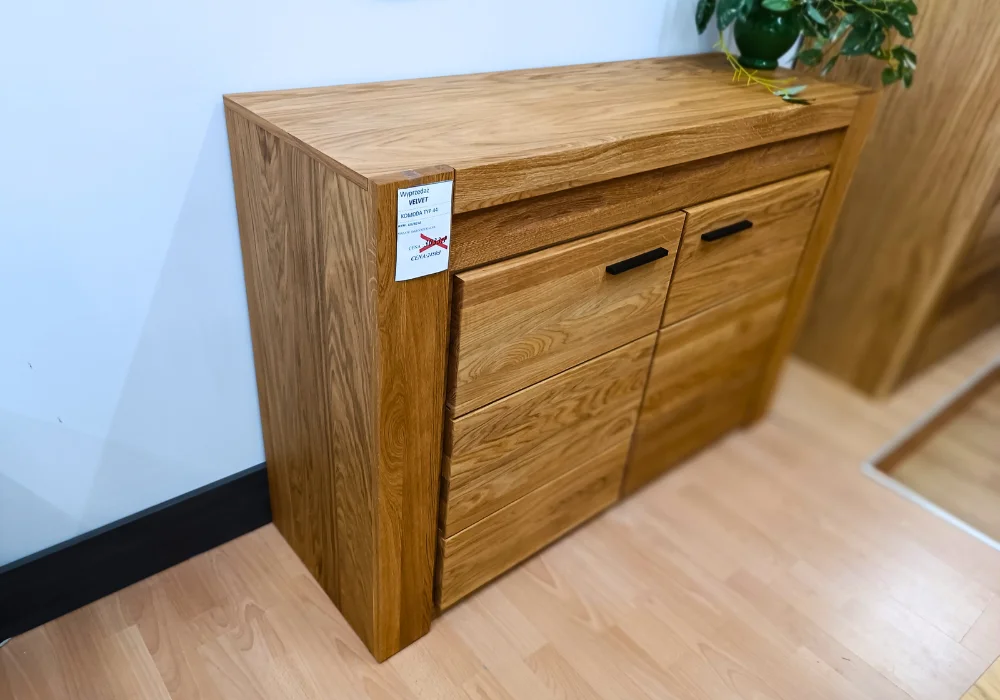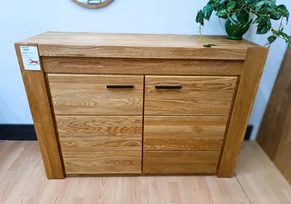 Komoda Velvet 44 zachwyca nowoczesną linią i starannie wykończonymi detalami. Dwa fronty z litego dębu skrywają przestronne półki, które pomogą utrzymać porządek w salonie lub sypialni. Ciepłe światło podkreśla strukturę drewna, wydobywając jego naturalne piękno.