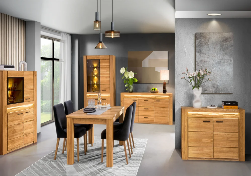 Zestaw mebli Velvet Natura marki Szynaka Meble to propozycja dla osób, które cenią ponadczasowy design, solidne wykonanie i piękno naturalnych materiałów. W skład zestawu wchodzi elegancka komoda z oświetleniem oraz pojemna szafa – oba elementy tworzą spójną, harmonijną całość.