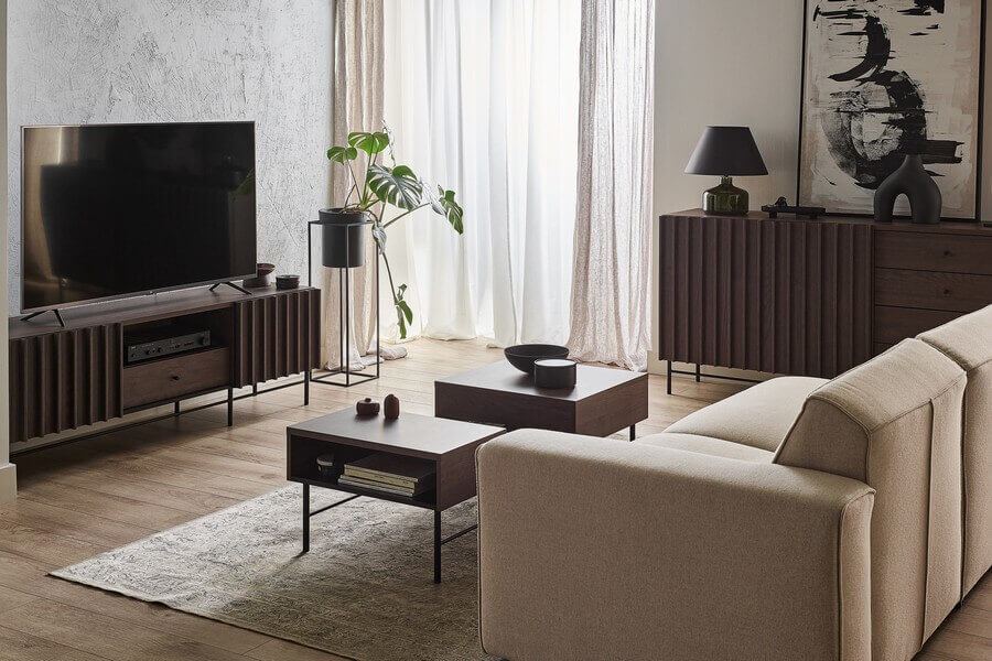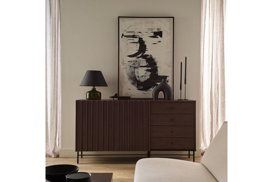 Oryginalne zestawienie koloru jesion Portland z metalowymi czarnymi dekorami nadaje jej wyjątkowego charakteru. Smukłe lamele stanowią kolejny atut, który przyciąga uwagę osób, które podążają za trendami i cenią sobie unikalny design.