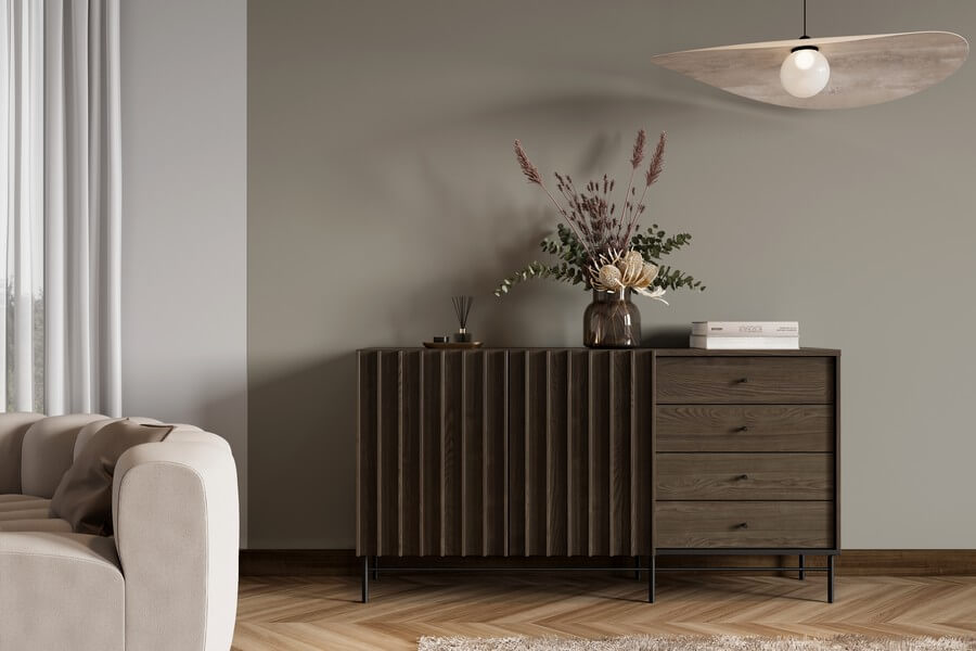 Cztery szuflady komody zapewniają dużo miejsca do przechowywania różnorodnych przedmiotów, dzięki temu, utrzymanie porządku w Twoim domu staje się łatwiejsze niż kiedykolwiek wcześniej. Dodatkowo, komoda ta wyróżnia się prostotą i eleganckim wyglądem, który dodaje uroku Twojemu wnętrzu.