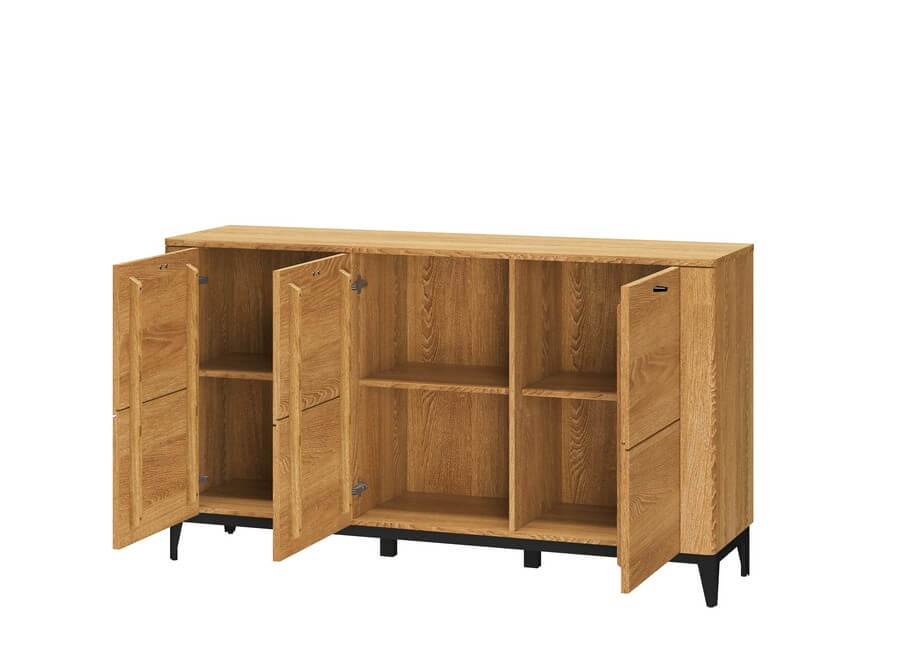 Stylowa kolorystyka olejowanego dębu w odcieniu złotym, połączona z czarnymi detalami, nadaje komodzie subtelny, ale wyrafinowany charakter. To mebel, który nie tylko pełni funkcję przechowywania, ale także stanowi elegancki akcent w aranżacji. Dodatkowo, system cichego domyku zapewnia płynne i bezgłośne zamykanie drzwi, co znacząco podnosi komfort codziennego użytkowania.