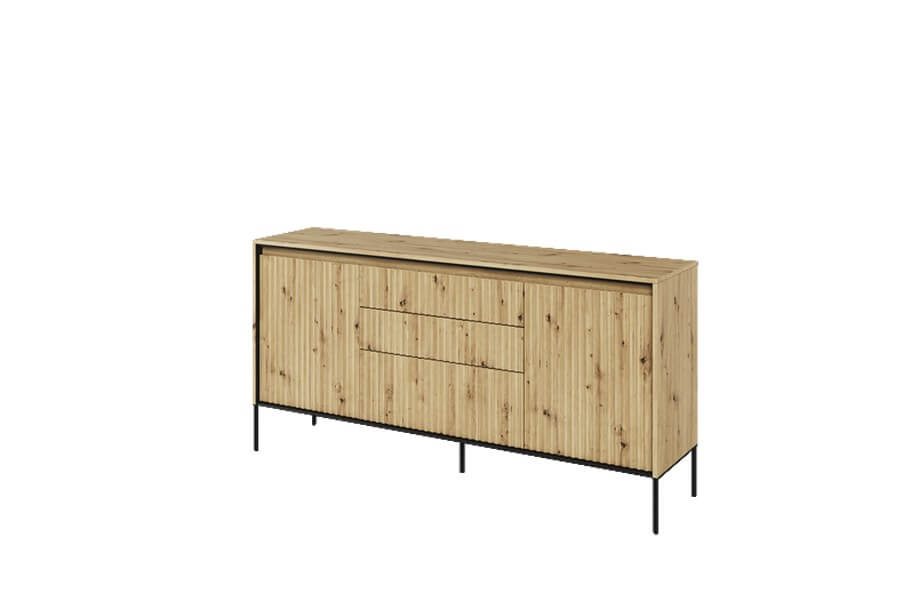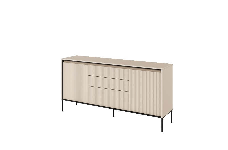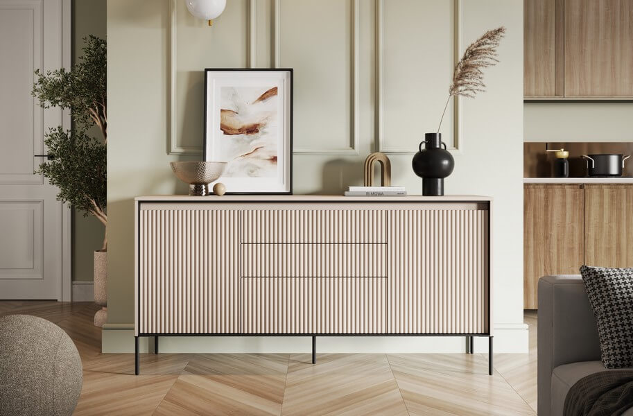 Kolekcja mebli oferuje trzy różne rodzaje ryflowania, które dodają charakteru i wyjątkowości wnętrzom. Każdy najmniejszy detal ma znaczenie, a kolorystyka mebli wpływa na wybór konkretnego rodzaju ryflowania. Fronty mebli w kolorze dąb artisan i czarnym zdobi frezowanie proste, białych i szarych w formie półkoli, natomiast meble w kolorze beżu piaskowego mają charakterystyczny frez w postaci półwałka. Dzięki temu, kolekcja oferuje różnorodne opcje, które pozwalają dopasować meble do indywidualnych preferencji i stylu wnętrza.