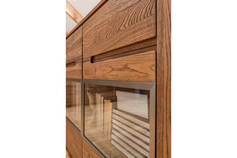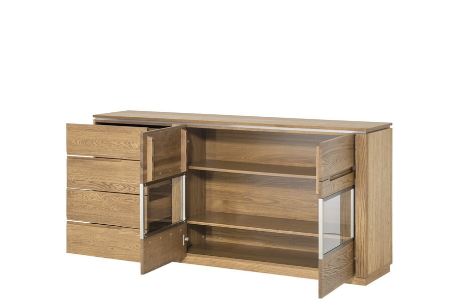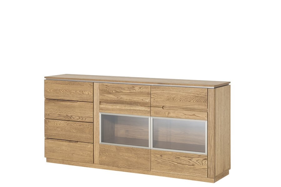 Cztery funkcjonalne szuflady i przestronne szafki z elementami przeszklonymi pozwolą wprowadzić ład i harmonię w każdym wnętrzu. Kolorystyka olejowanego dębu rustical stwarza ogromne możliwości aranżacyjne a przestronne, pojemne szuflady stwarzają wiele miejsca do przechowywania. Przeszklona przestrzeń pozwoli wyeksponować ulubione ozdoby.
