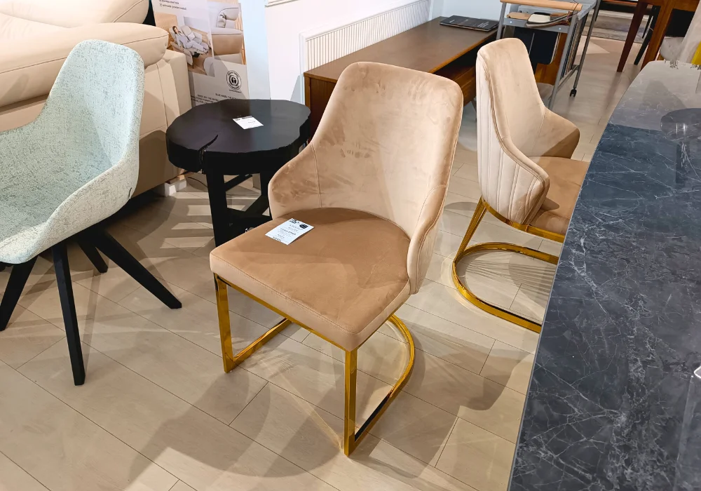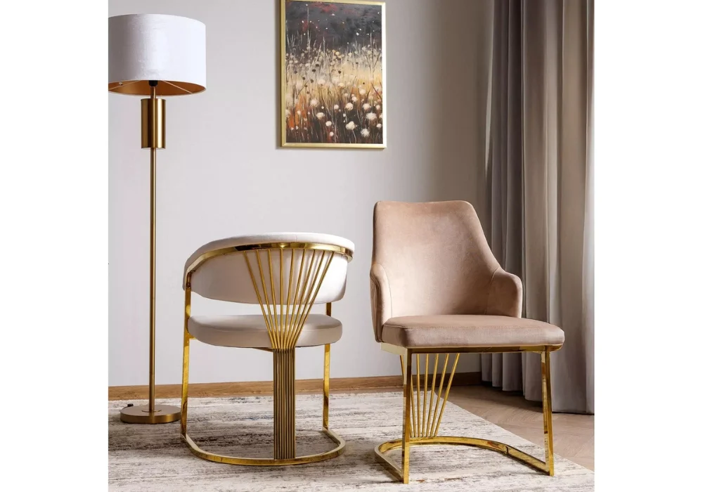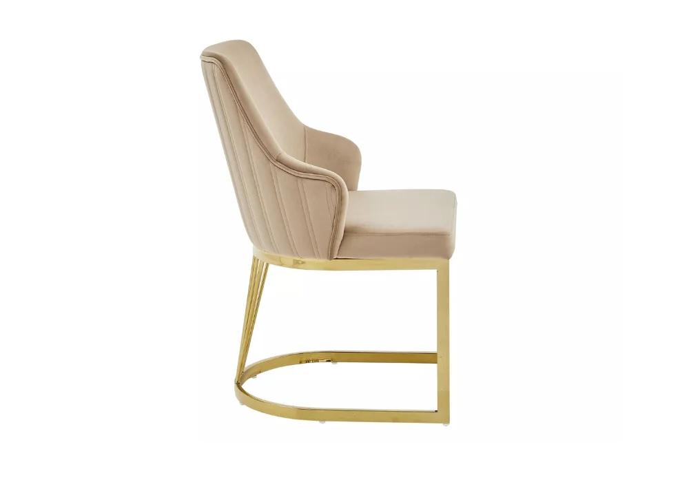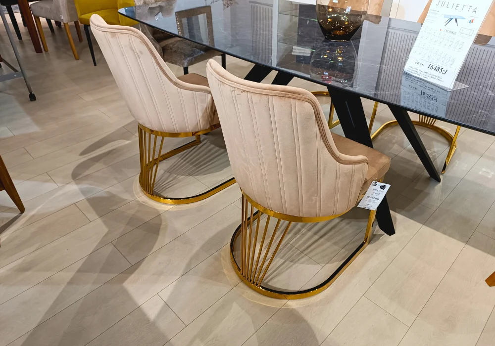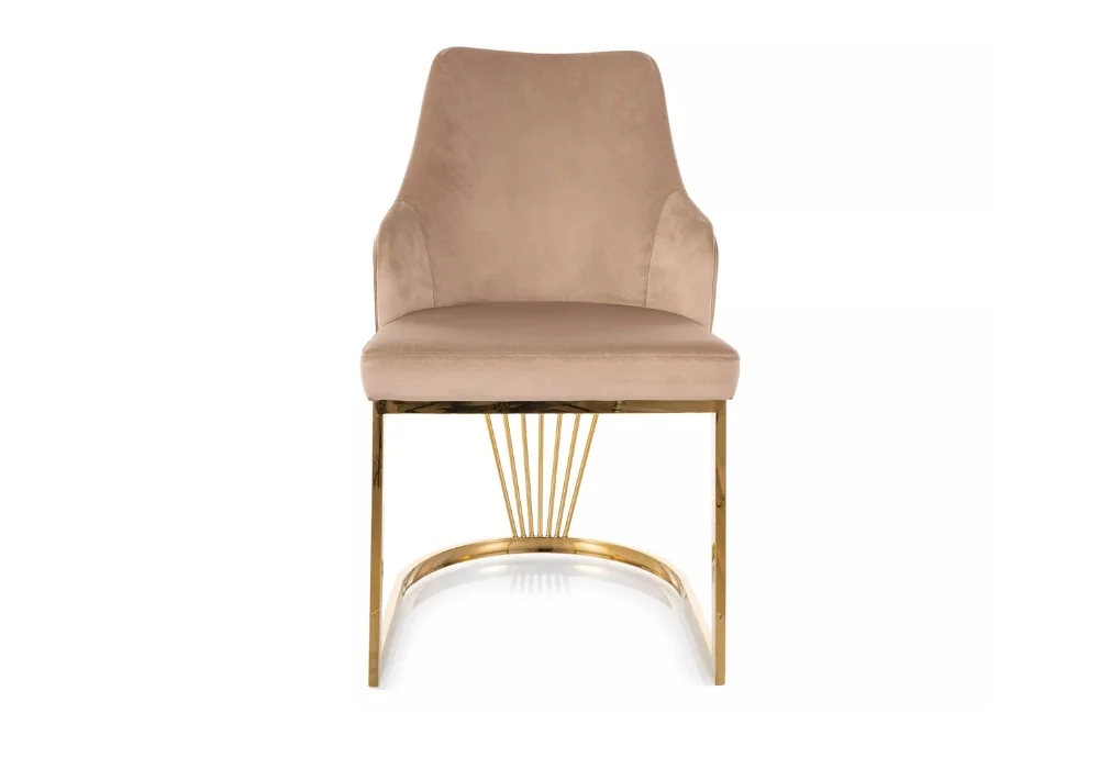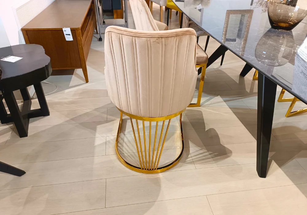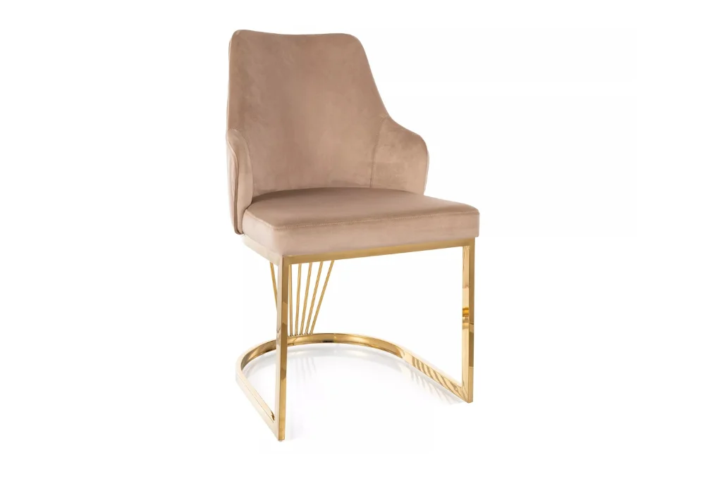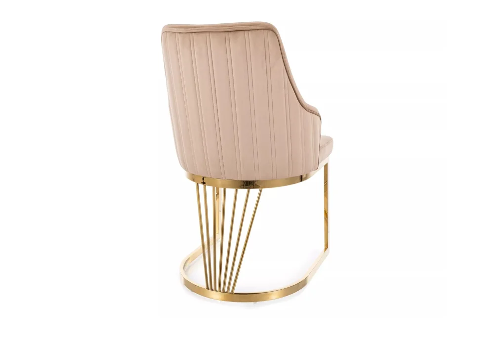 Miękkie, tapicerowane siedzisko oraz starannie wyprofilowane oparcie zapewniają wygodę nawet podczas długiego siedzenia, a złoty metalowy stelaż dodaje całości subtelnej elegancji i nowoczesnego sznytu.