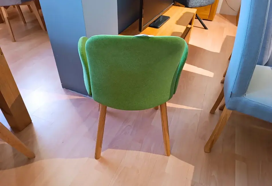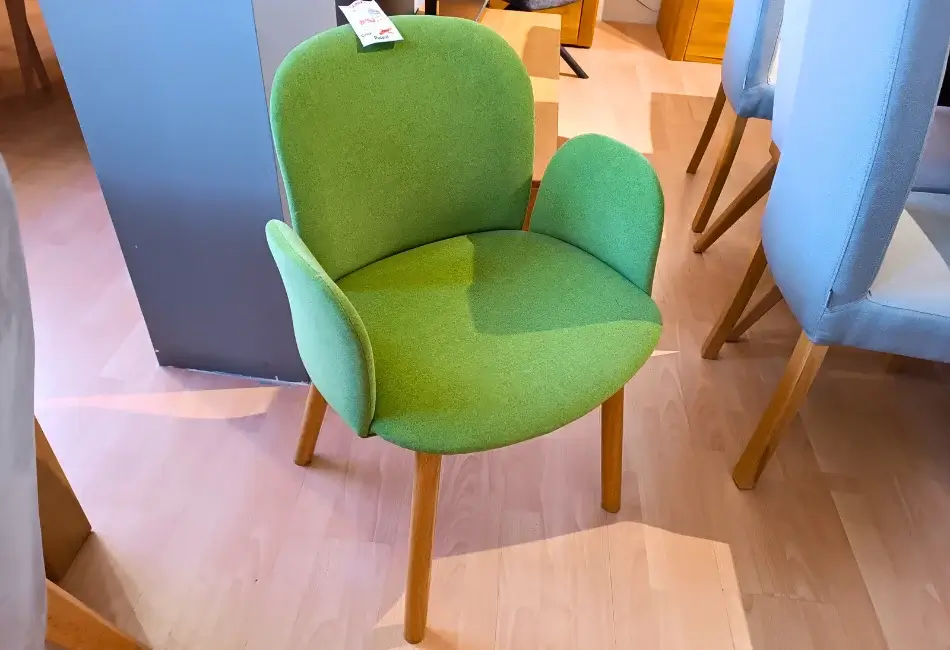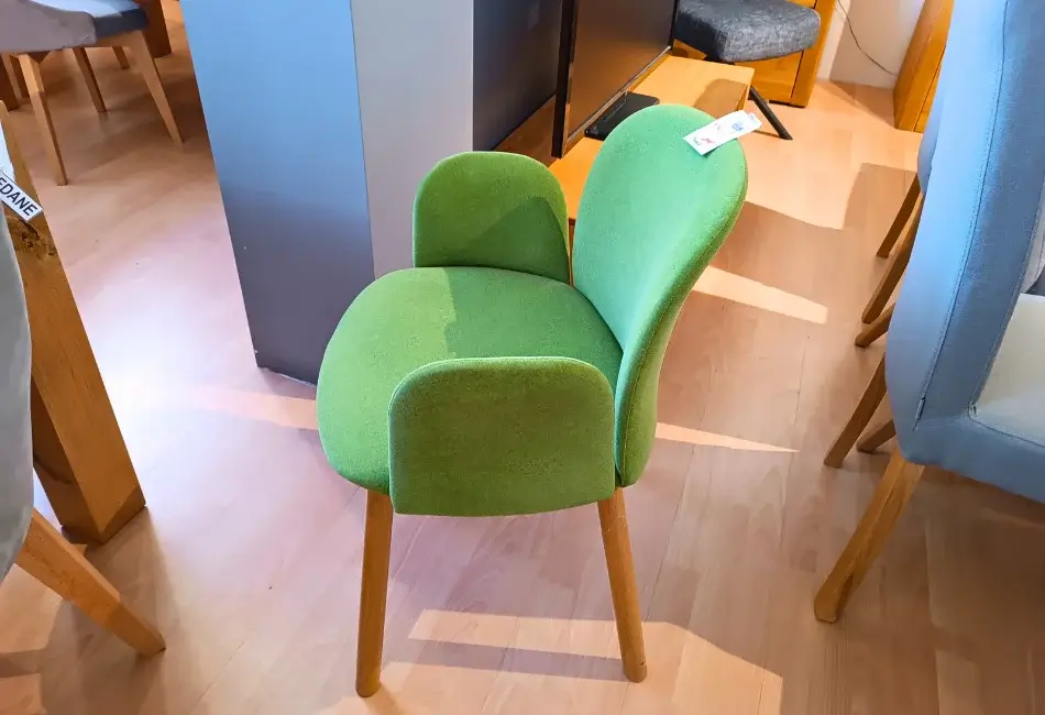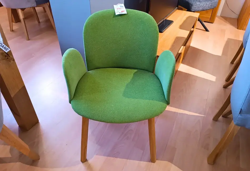 Krzesło April wyróżnia się konstrukcją inspirowaną tulipanem, gdzie oparcie i podłokietniki przypominają płatki kwiatu, tworząc harmonijną, subtelną formę. Dobór tkaniny tapicerskiej Nordic 97 w żywych odcieniach dodatkowo podkreśla klimat wnętrza, w którym się znajduje.