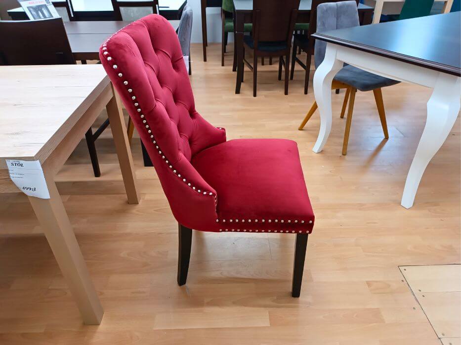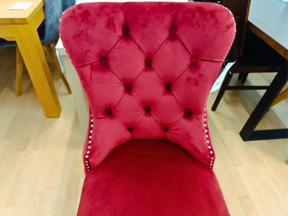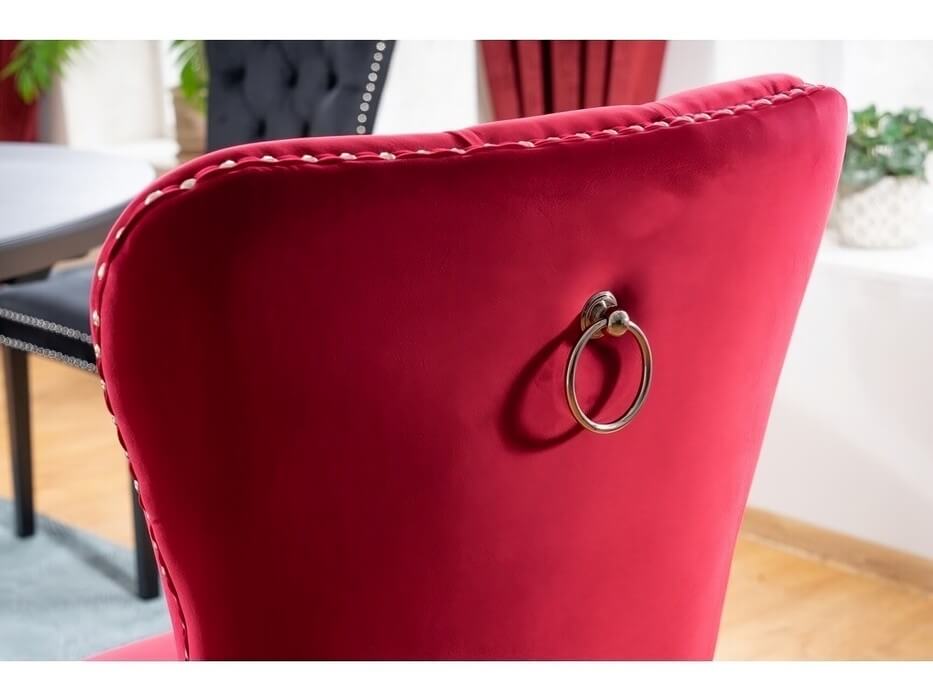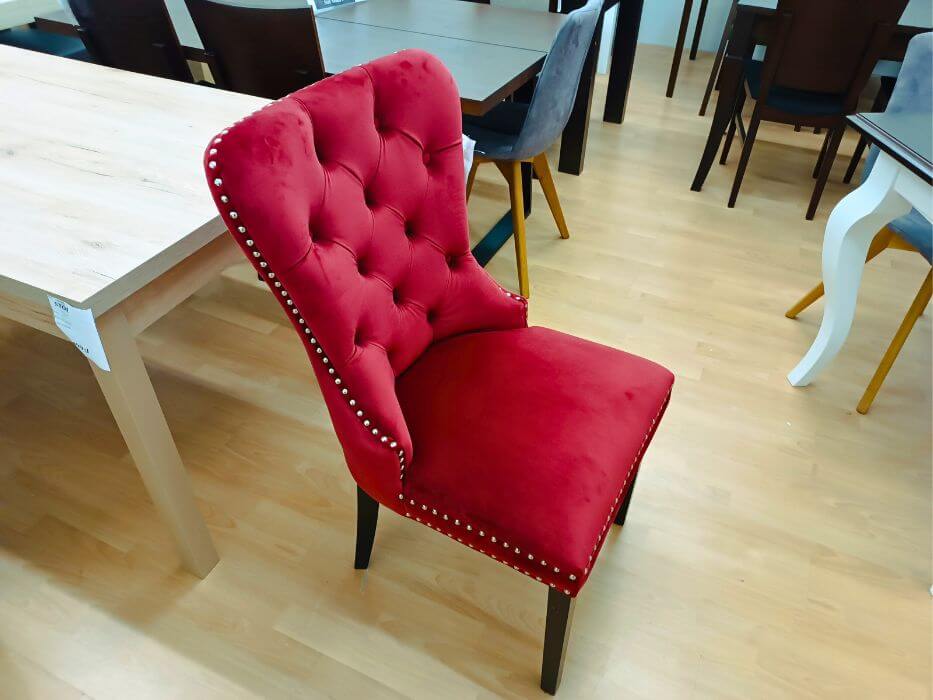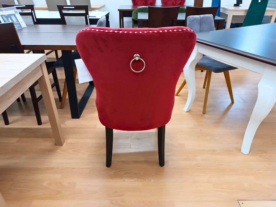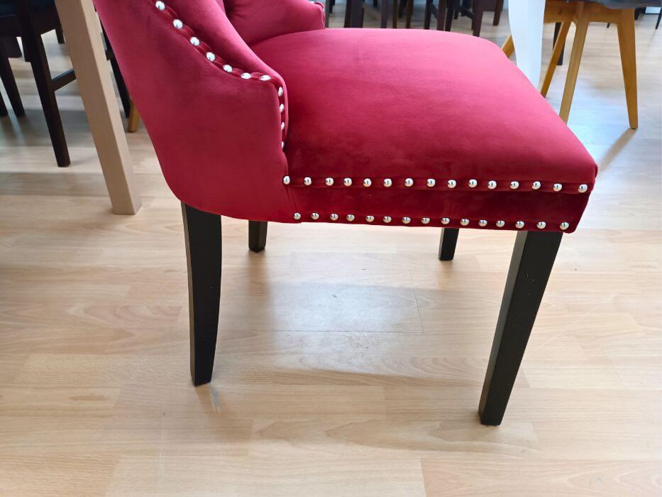 Wyjątkowego charakteru dodają krzesłu dekoracyjne pikowania oraz pinezki, które biegną wzdłuż krawędzi mebla. Z tyłu krzesła umieszczona jest ozdobna kołatka, która podkreśla jego stylowy wygląd. Materiał: aksamit Bluvel 59, nogi z drewna.