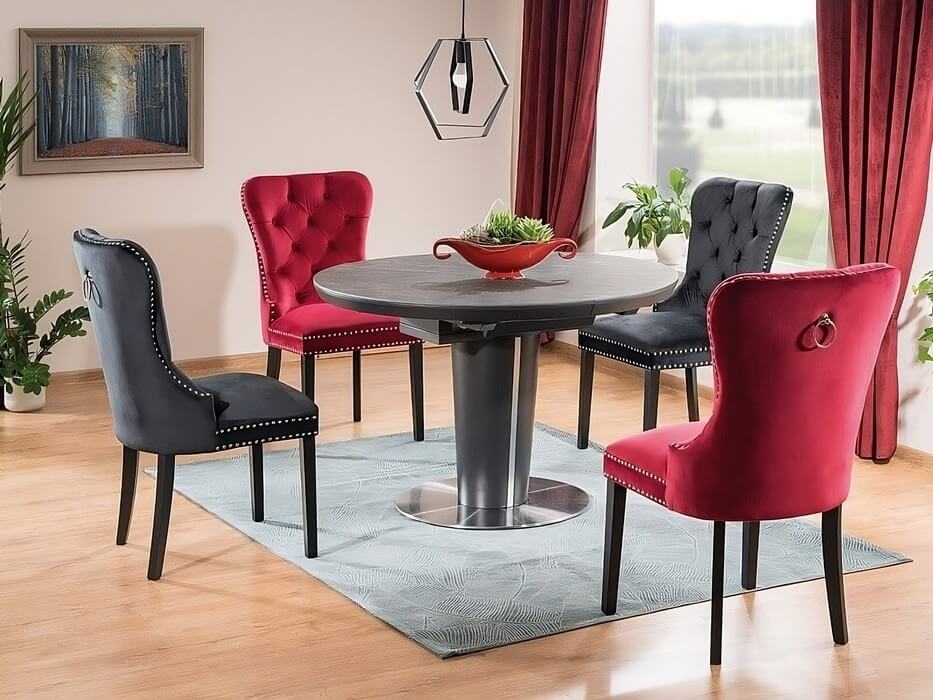 Krzesło August wyróżnia się tapicerką wykonaną z wysokiej jakości tkaniny Velvet 59. Stabilność i wytrzymałość zapewniają solidne, drewniane nogi w eleganckim czarnym kolorze.