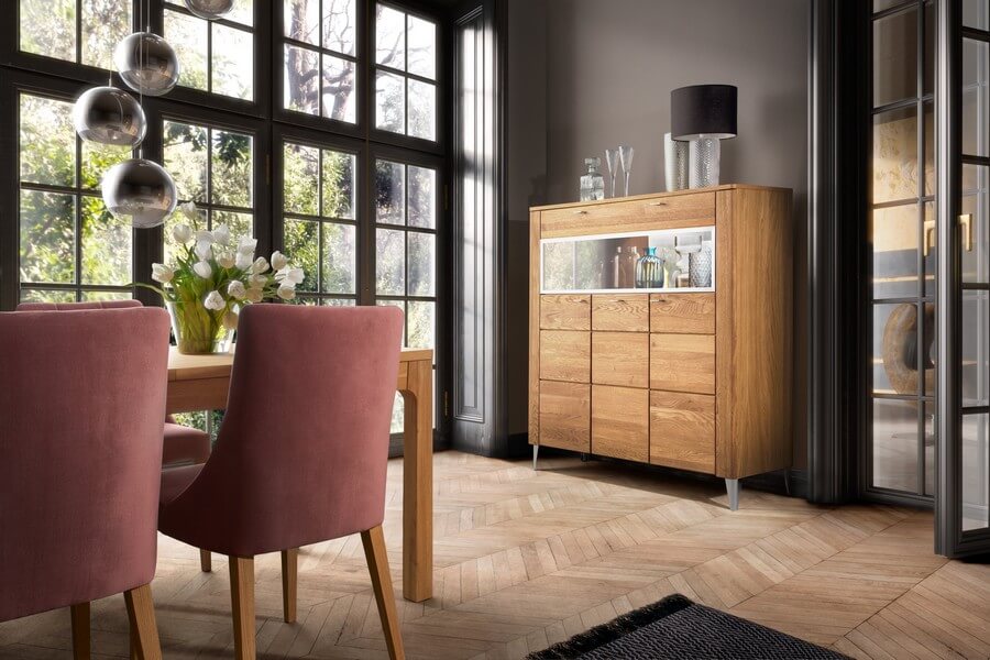Latina to wyjątkowa kolekcja która wyróżnia się nie tylko chromowanym ramkami ale również niepowtarzalnymi, rzucającymi się w oczy metalowymi stopkami w kolorze srebrno-chromowanym. Meble w ciepłym naturalnym kolorze wyposażone w te wyjątkowe stopki dodadzą elegancji i niespotykanego charakteru każdemu salonowi lub jadalni.