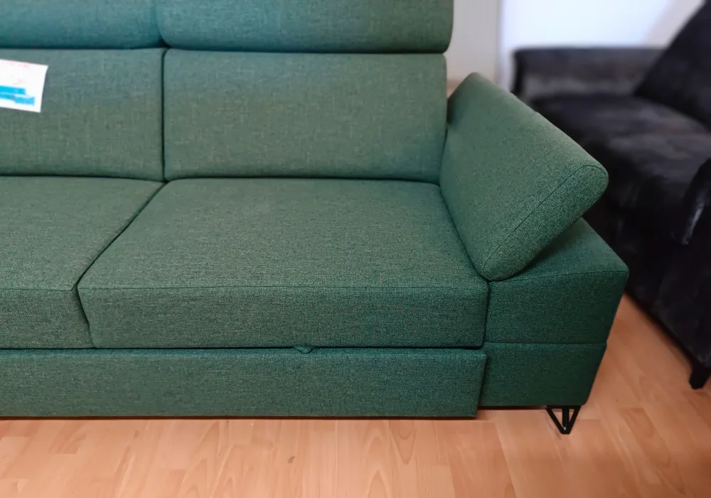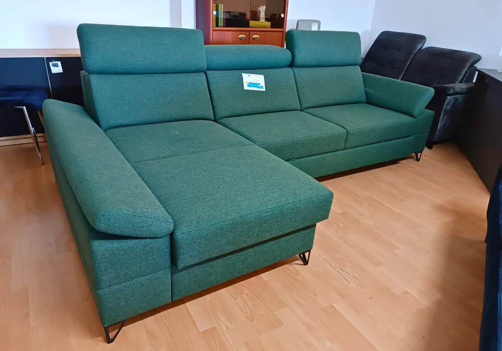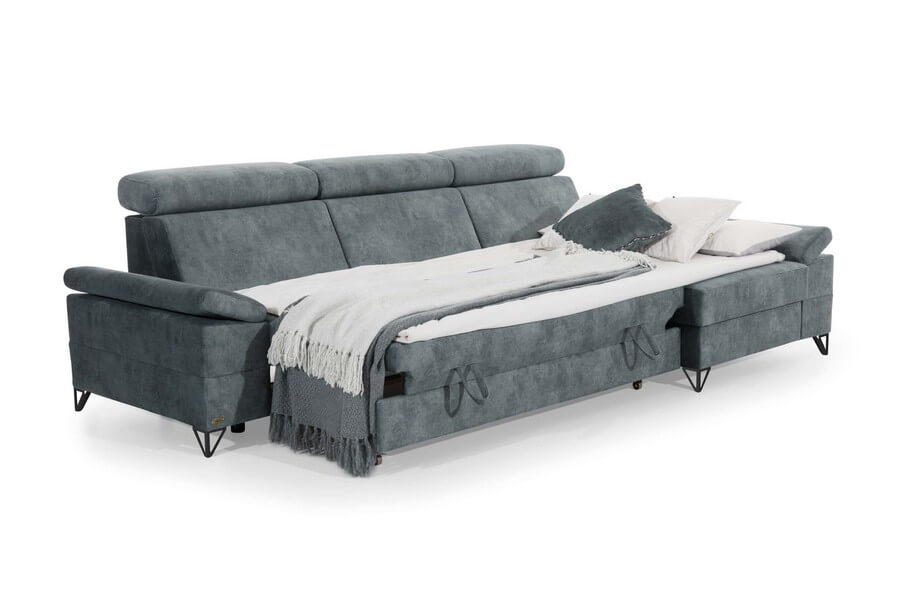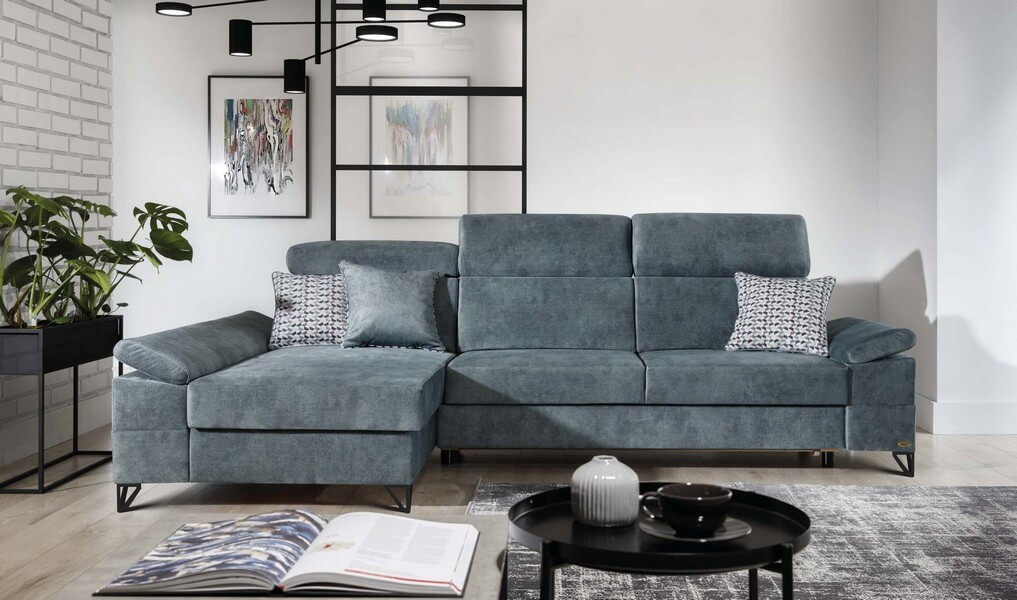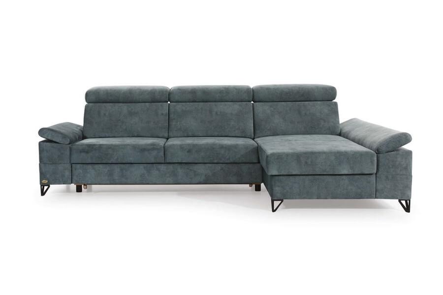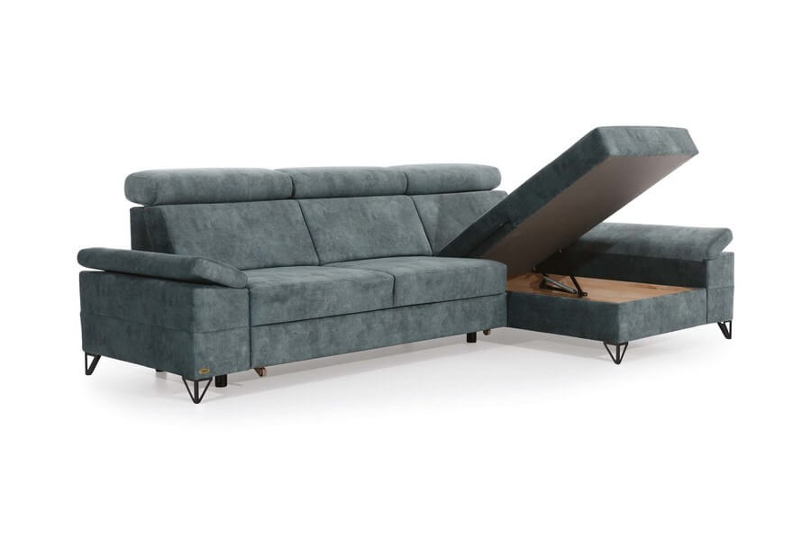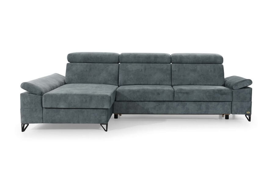 Narożnik posiada przestronny pojemnik w otomanie oraz funkcję rozkładania do spania, co zwiększa jej funkcjonalność. Regulowane zagłówki i podłokietniki zapewniają użytkownikom dodatkowy komfort. Nogi mebla w kolorze czarnym. Oferowany narożnik w wersji lewostronnej i tapicerowany jest wysokiej jakości tkaniną 463.