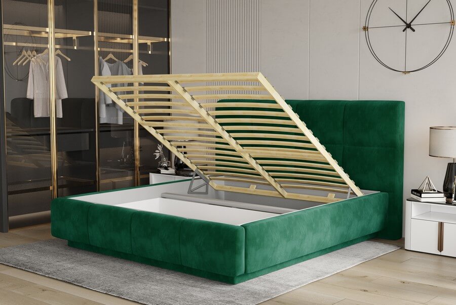 Asti nie tylko prezentuje się znakomicie, ale także oferuje praktyczne rozwiązania. Wbudowany podnoszony pojemnik stanowi doskonałe rozwiązanie dla osób, które pragną optymalnie wykorzystać przestrzeń w sypialni. Pościel czy inne przedmioty mogą być przechowywane w tym dyskretnym schowku, pomagając utrzymać porządek i harmonię we wnętrzu.