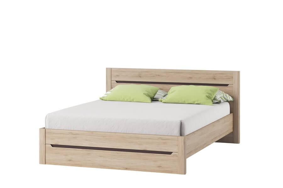 Duże, dwuosobowe łóżko w kolorze dębu san remo ze wstawkami w kolorze brązu uni. To uniwersalne łoże wpasuje się w wiele aranżacji, zarówno sypialni jasnych jak i ciemnych. Łóżko występuje w dwóch wymiarach: 180x90x208 cm i 160x90x208 cm.