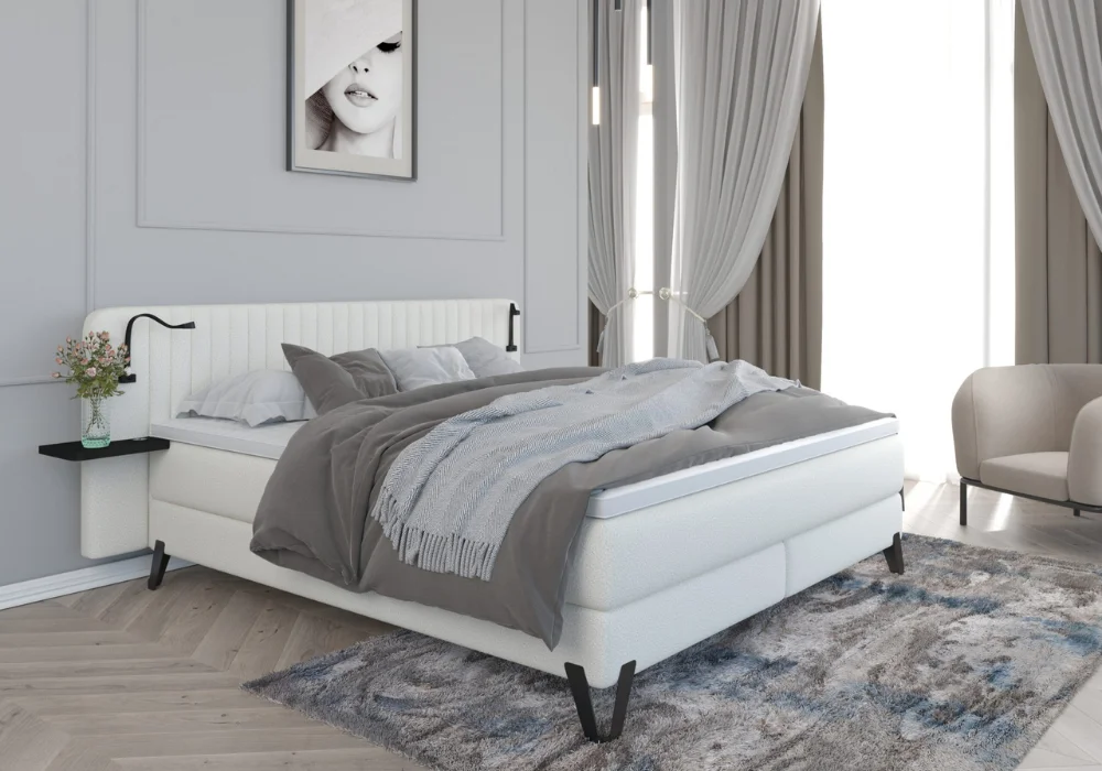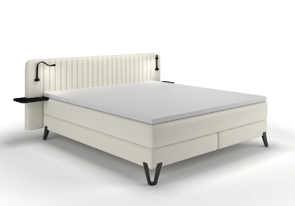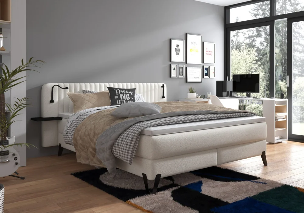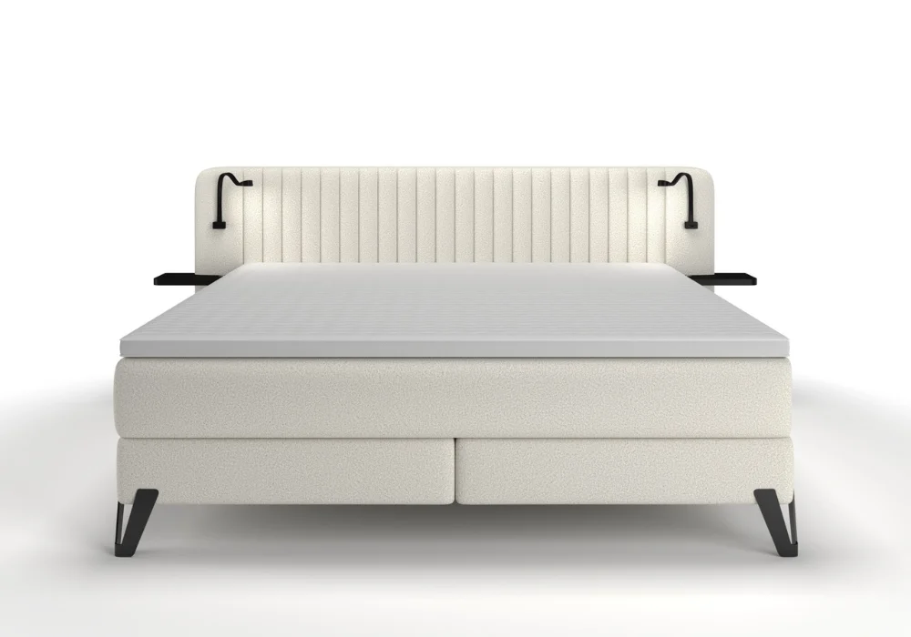 Uwagę od razu przyciąga tapicerowane wezgłowie o wysokości 106 cm, ozdobione eleganckim pikowaniem. Pełni ono nie tylko funkcję estetyczną oraz zapewnia wygodne oparcie podczas czytania czy wieczornego relaksu. Zintegrowane metalowe półki, oświetlenie LED, ładowarki indukcyjne oraz port USB sprawiają, że wszystko, co potrzebne przed snem i tuż po przebudzeniu, jest zawsze pod ręką.
