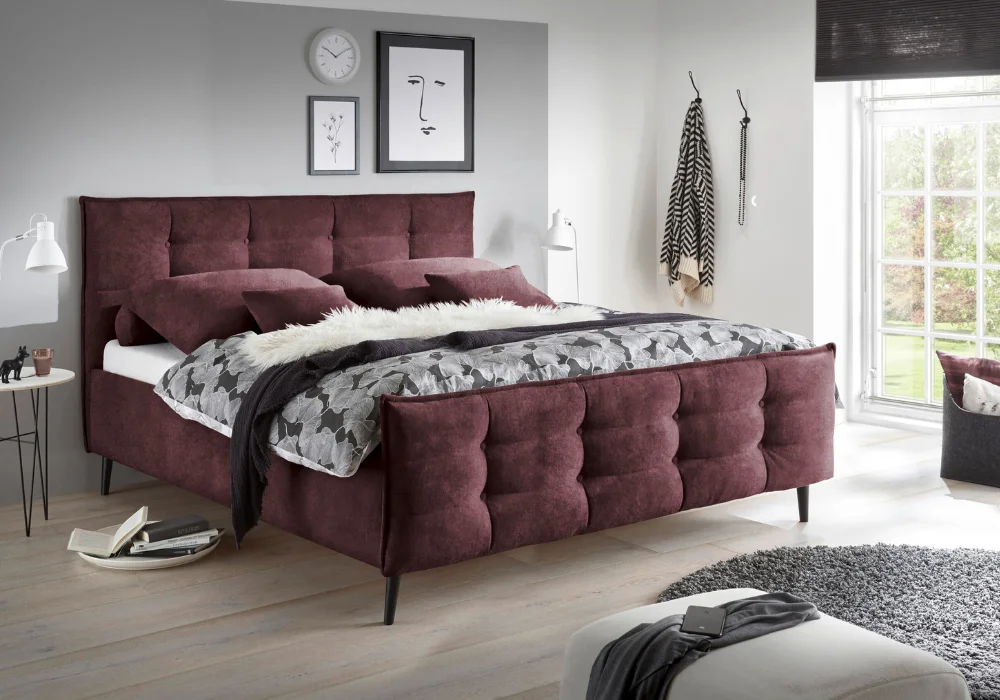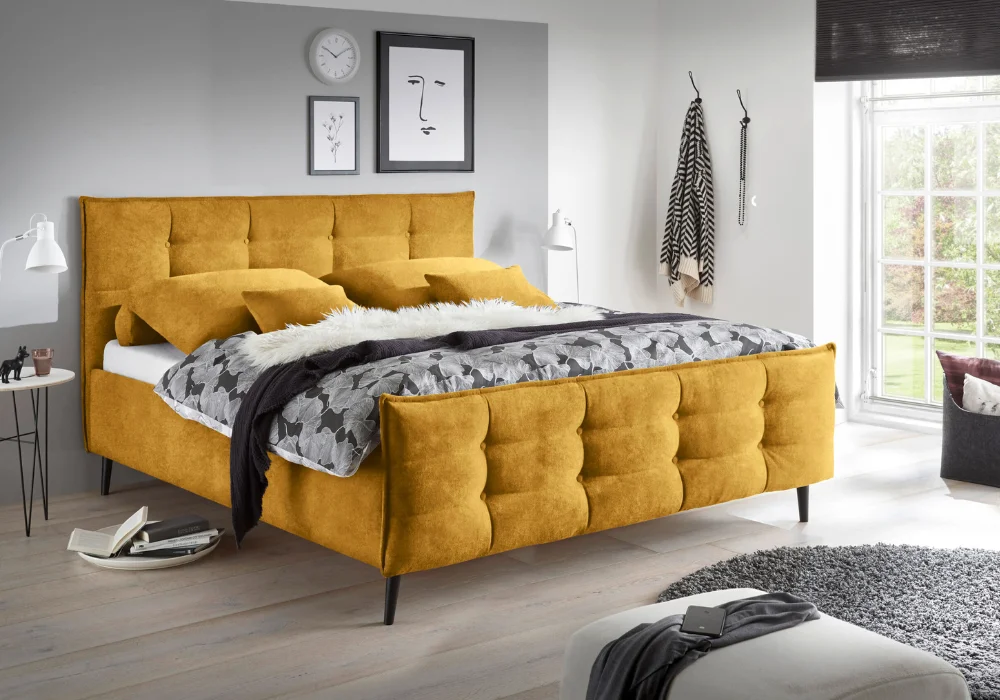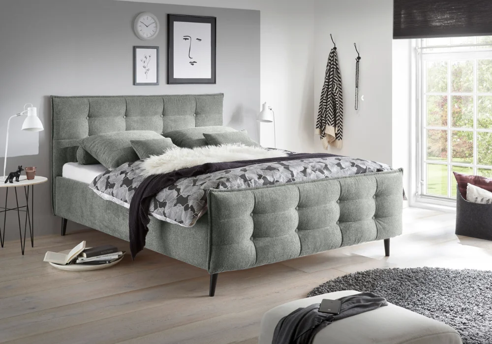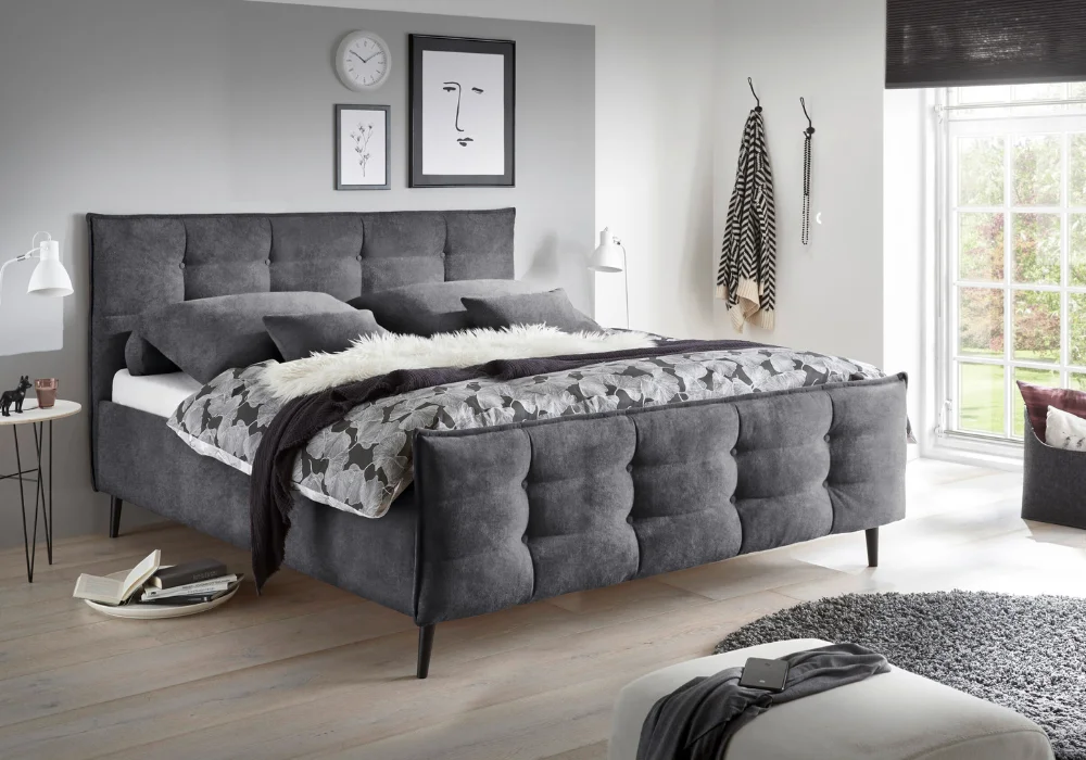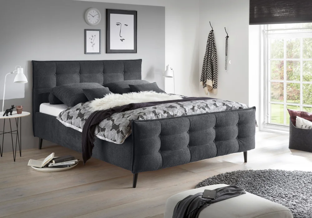 Jego znakiem rozpoznawczym jest wysokie, pikowane wezgłowie, które nadaje bryle elegancki charakter i jednocześnie zapewnia wygodne oparcie podczas wieczornego odpoczynku. Forma jest zdecydowana, ale nie ciężka, dobrze wpisuje się w współczesne aranżacje sypialni.