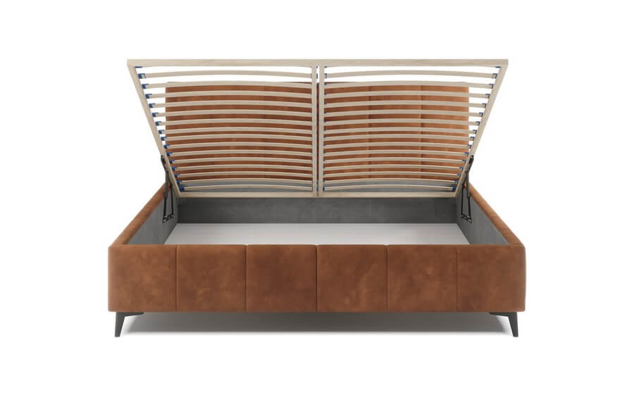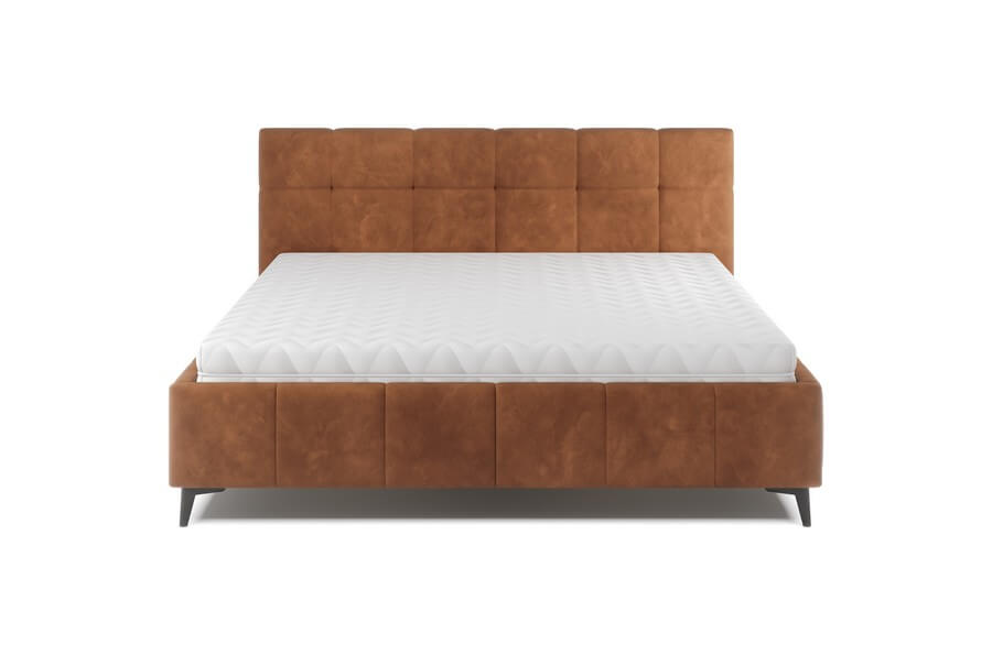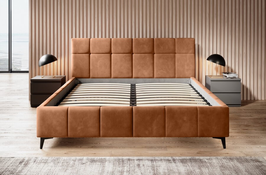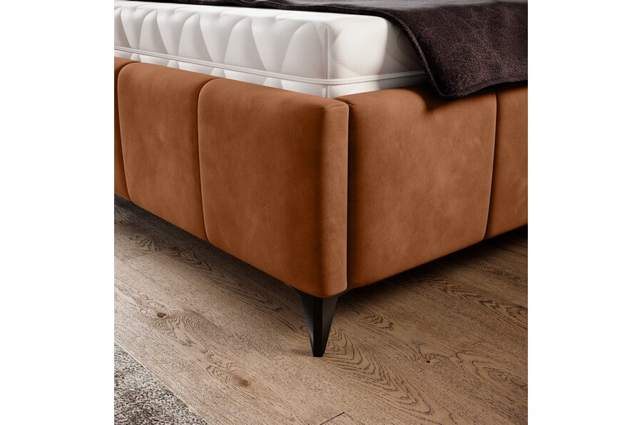 Rama łóżka jest równie imponująca, z eleganckimi przeszyciami kontynuującymi się z wezgłowiem, tworząc spójną i harmonijną całość. Jednak to wysokie, metalowe nogi są prawdziwym znakiem rozpoznawczym tego modelu. Ich delikatna konstrukcja dodaje lekkości całemu łóżku, tworząc wrażenie unoszenia się nad podłogą i nadając przestrzeni sypialnianej subtelny i nowoczesny wygląd.