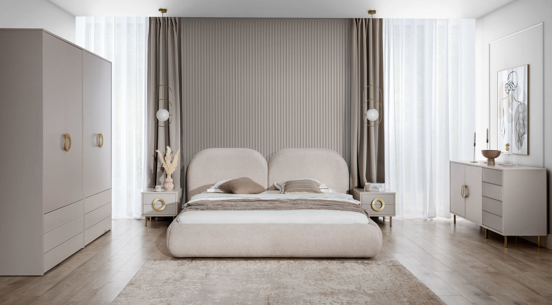 Dostępne w trzech różnych szerokościach – 180, 200 oraz 220 cm, łóżko dostosowuje się do różnych potrzeb, zapewniając komfortowy sen dla par o różnych preferencjach szerokości materaca: 140, 160 lub 180 cm. Z wysokością wezgłowia wynoszącą 95 cm, to łóżko nie tylko stanowi stabilną podstawę do spania, ale także stanowi ozdobę wnętrza, które podkreśla jego styl i charakter. Jego znacząca głębokość, wynosząca 233 cm, gwarantuje przestrzeń do wypoczynku i relaksu.