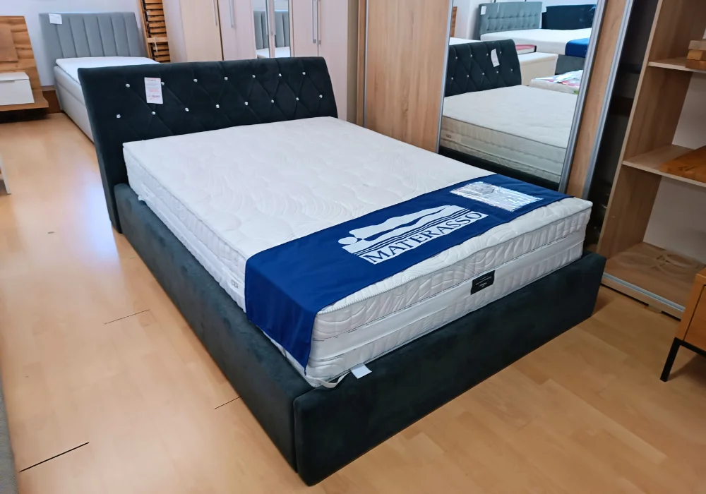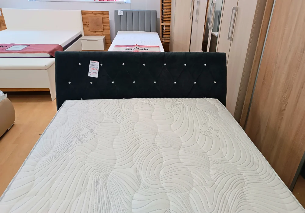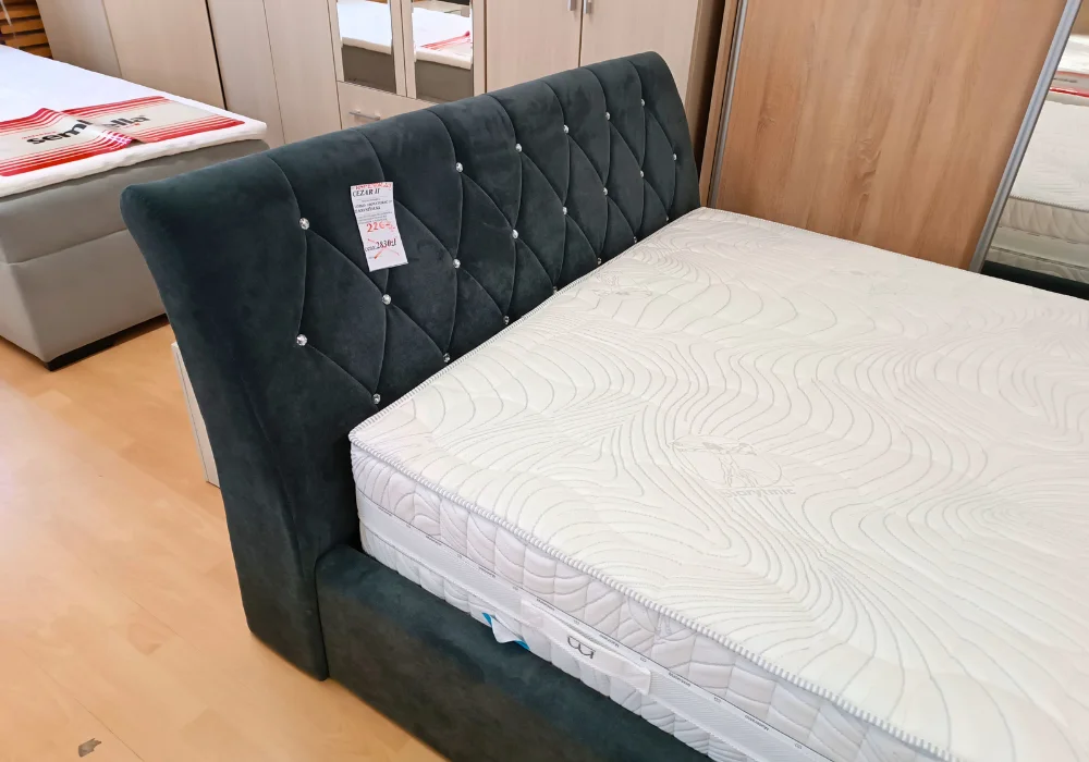 Łóżko tapicerowane Cezar II przyciąga uwagę welurową tkaniną w głębokim, grafitowym kolorze, która nadaje mu wyjątkowy styl. Jego profilowany zagłówek, ozdobiony dekoracyjnymi przeszyciami w formie rombów i 22 błyszczącymi kryształkami, nie tylko pełni funkcję wygodnego oparcia, ale też stanowi wyjątkowy element dekoracyjny, podkreślający luksusowy charakter łóżka.