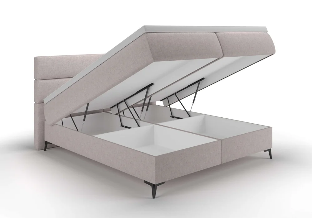 Dwukomorowy pojemnik na pościel oferuje dużą przestrzeń do przechowywania i pozwala łatwo uporządkować tekstylia. Mechanizm oparty na sprężynach oraz siłownikach gazowych zapewnia płynne, lekkie otwieranie, bez wysiłku i hałasu. Całość osadzono na niewielkich, czarnych metalowych nóżkach, które podkreślają nowoczesną linię łóżka i ułatwiają utrzymanie czystości pod bryłą.