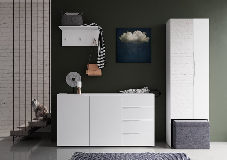 Nowoczesne, minimalistyczne meble w uniwersalnym białym kolorze, dzięki którym zaaranżujesz kilka pomieszczeń. Doskonale pasują do przedpokoju, salonu i jadalni czy przedpokoju – to Ty decydujesz gdzie powinny się znaleźć. Funkcjonalne szuflady pozwolą utrzymać porządek, a jasna kolorystyka rozświetli wnętrze, które wystarczy uzupełnić ulubionymi dodatkami.