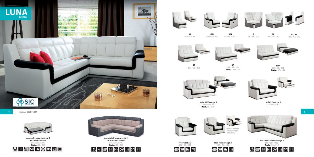 Luna to piękny i funkcjonalny narożnik, wyróżnia się pięknymi przeszyciami siedziska i oparcia. Dostępny jest w wersji lewostronnej lub prawostronnej. Posiada funkcję spania z pojemnikiem na pościel o powierzchni spania 130×210 cm.