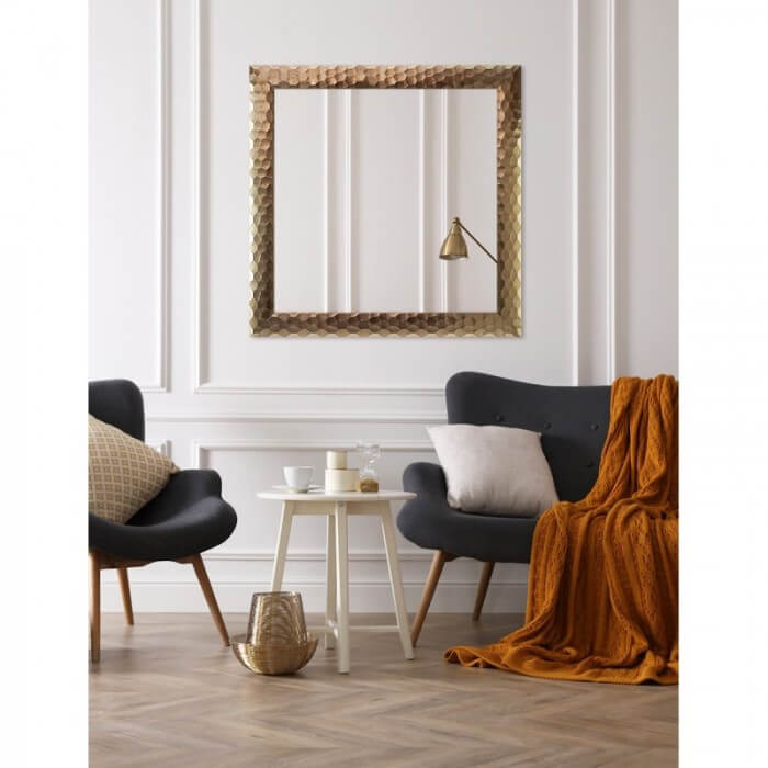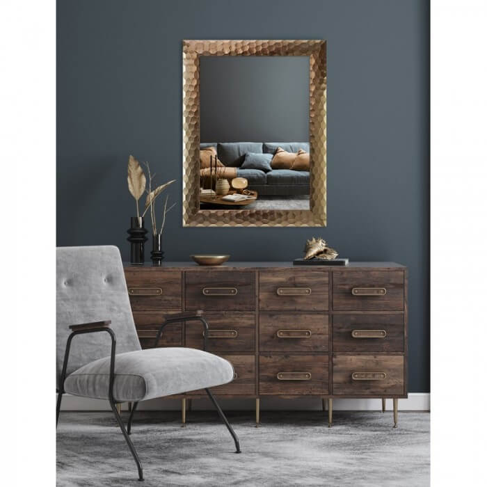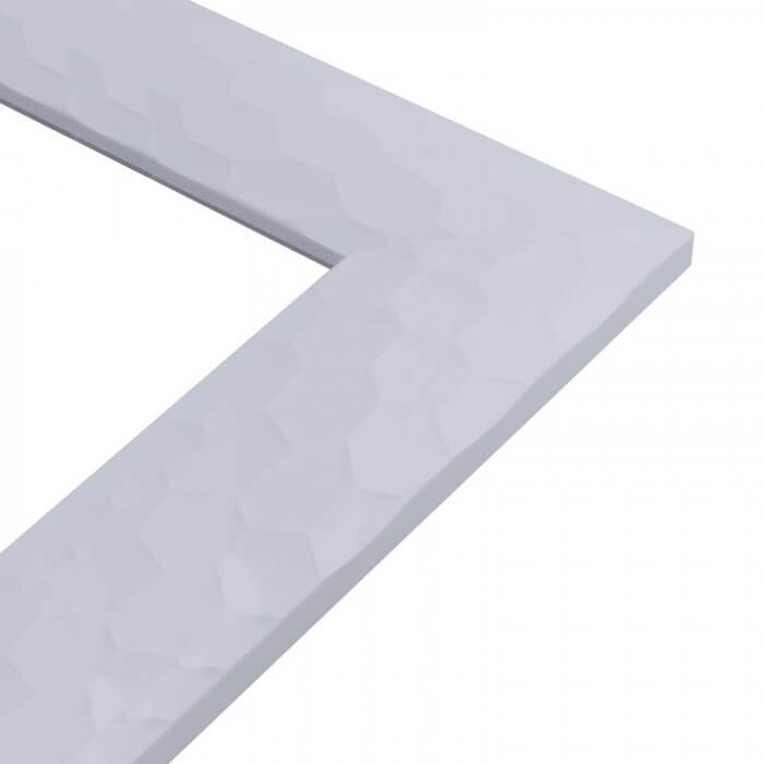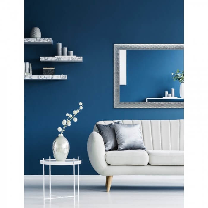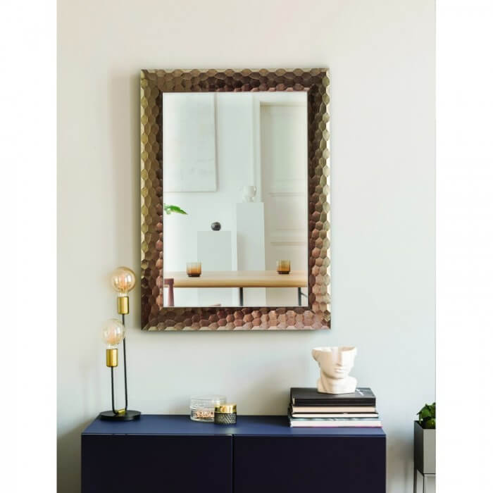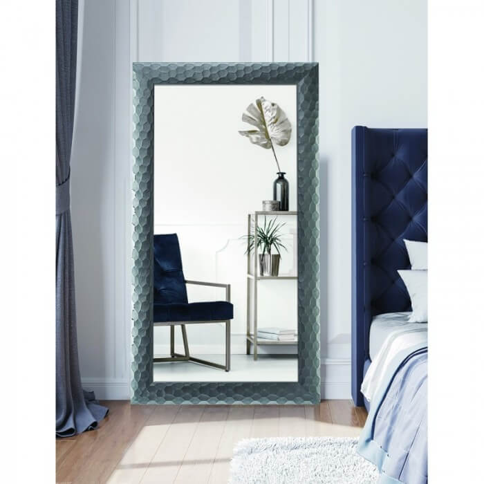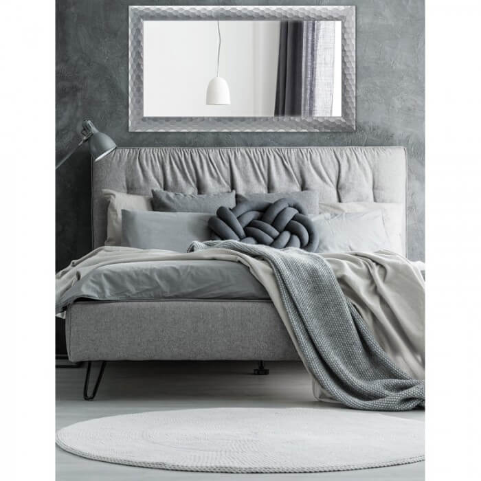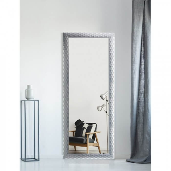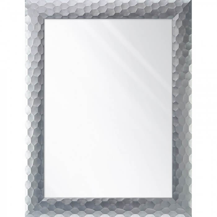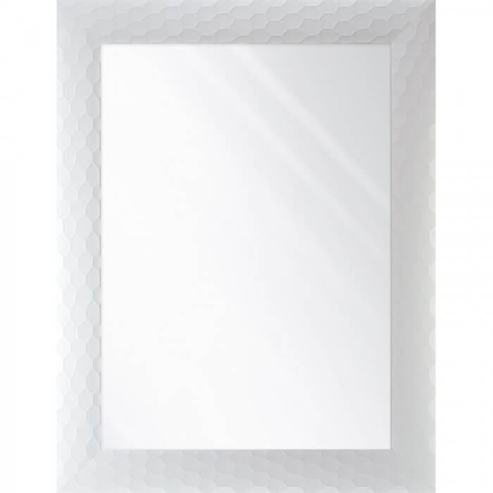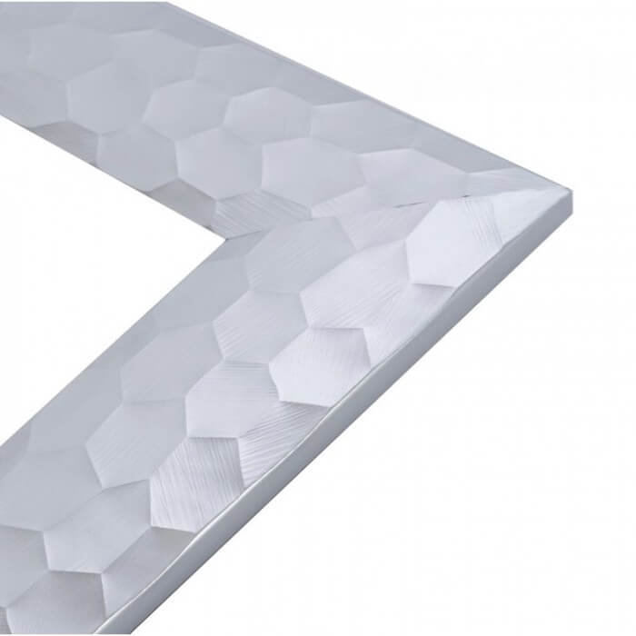 Lustro z ramą o profilu w kształcie łuku i wzorze imitującym większy plaster miodu. Rama dostępna w kolorach: srebrna, grafit, złota i białe. Tafla lustra wykonana ze szkła o grubości 4 mm z grafitowym podlewem z tyłu.