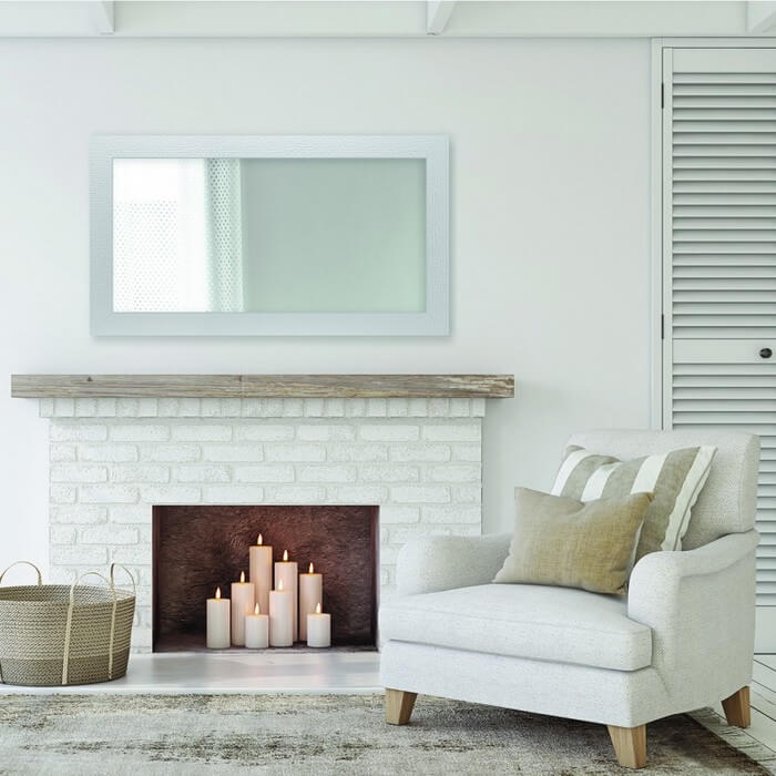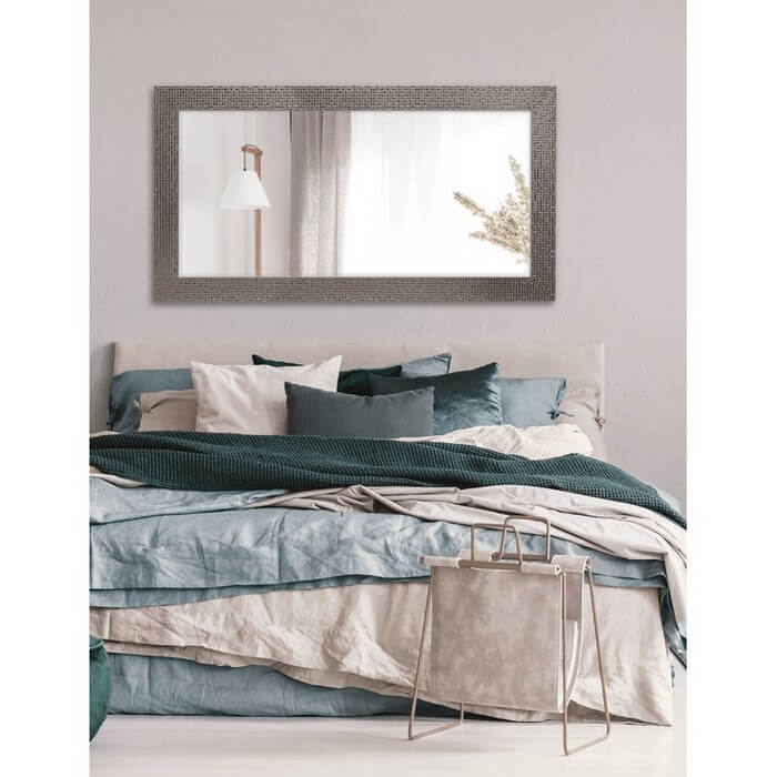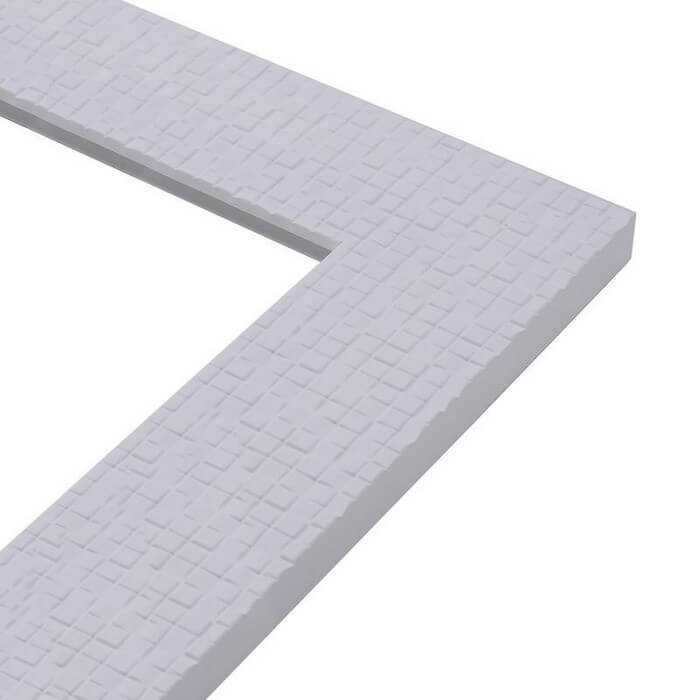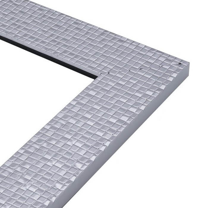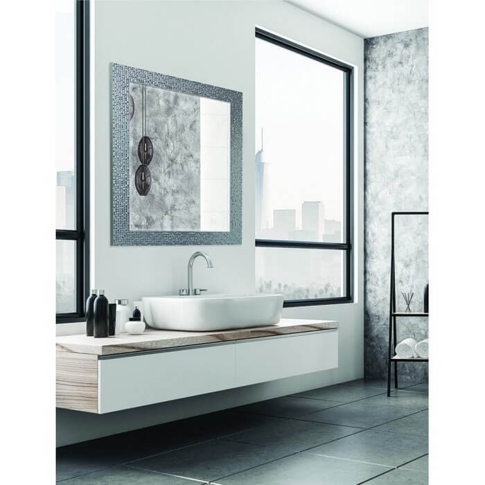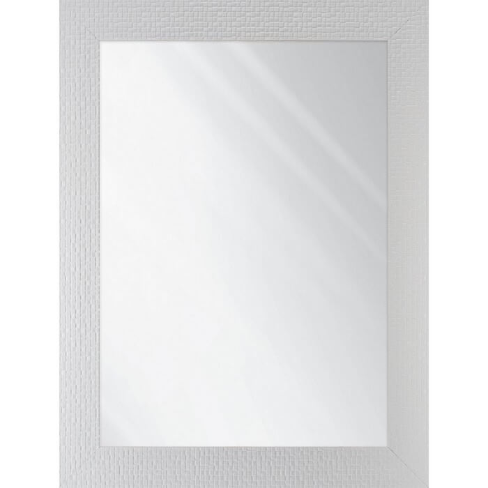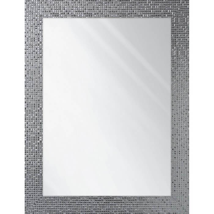 Lustro z ramą o wzorze składającym się z mieniących kwadratów. Rama dostępna w kolorach: biała, srebrna i satyna. Tafla lustra wykonana ze szkła o grubości 4 mm z grafitowym podlewem z tyłu.
