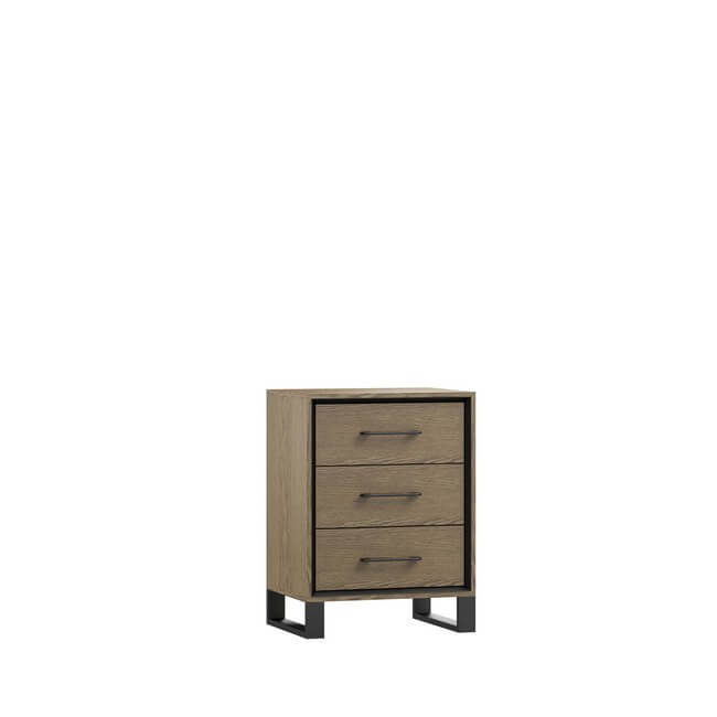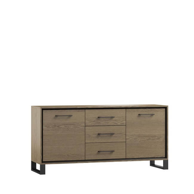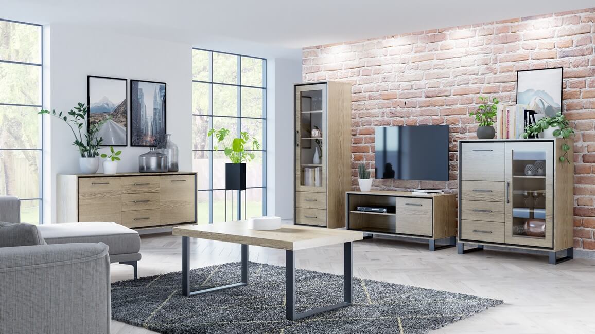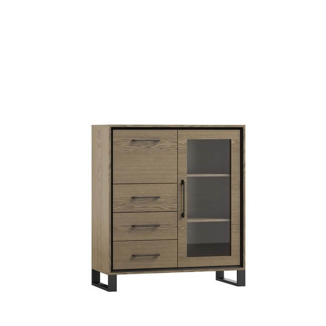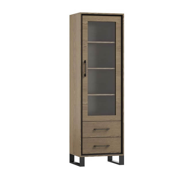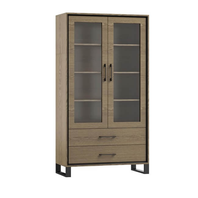 Korpus i fronty wykonane w całości z forniru dębowego wewnątrz a podstawa mebla to metal malowany w kolorze czarnego matu. Meble w kolorze dąb olejowany lub czarny mat. Uchwyty aluminiowe w kolorze czarny mat, fronty przeszklone – szkło bezbarwne.