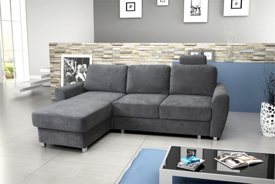 Kompaktowy narożnik Malibu wyposażony jest w praktyczną funkcję spania i pojemnik na pościel ukryty w otomanie oraz posiada zagłówek.
