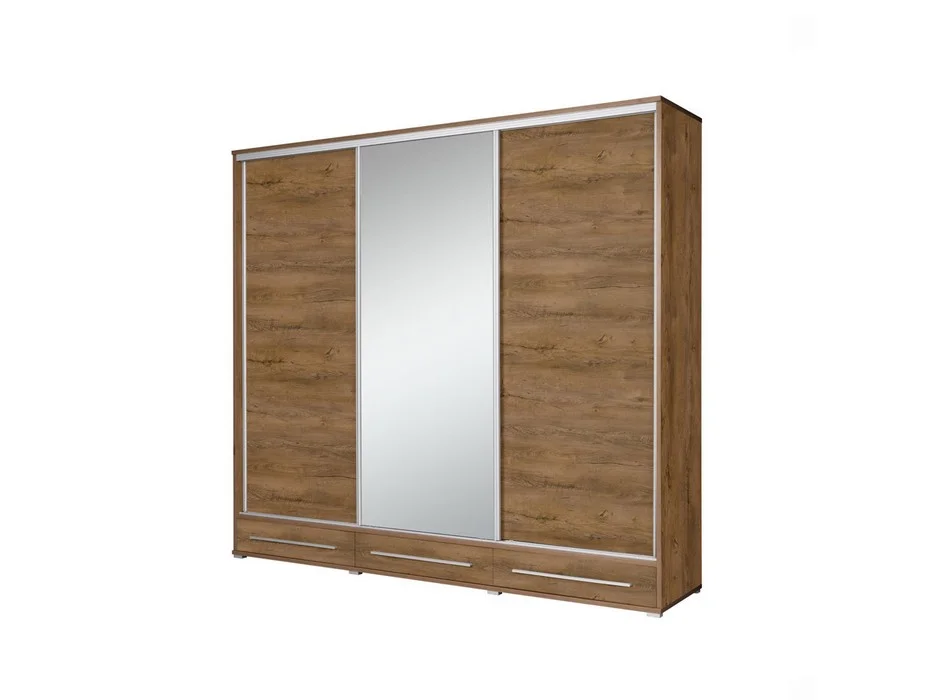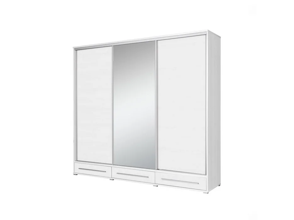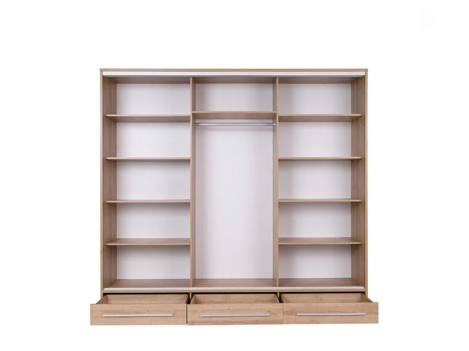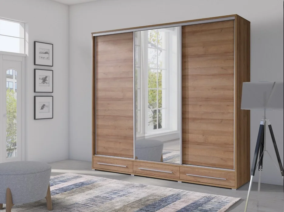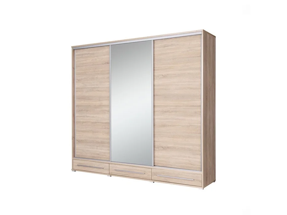 Front szafy wzbogacono o lustro, które nie tylko ułatwia codzienne przygotowania, ale także optycznie powiększa pomieszczenie i wprowadza do wnętrza nowoczesny akcent. Dzięki drzwiom przesuwnym szafa jest doskonałym rozwiązaniem nawet w mniejszych pomieszczeniach, gdzie istotne jest oszczędzanie miejsca.