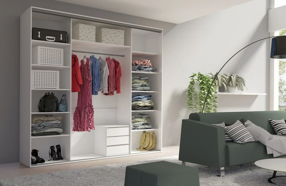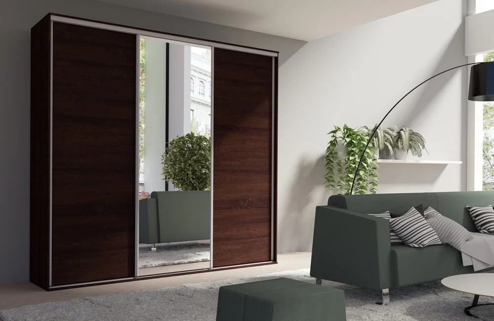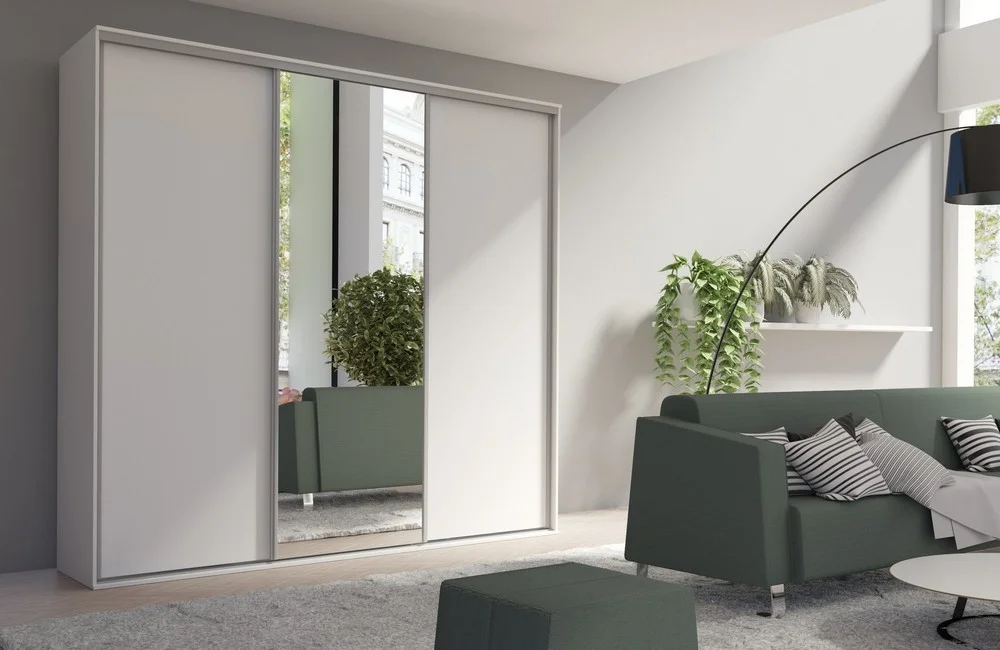Szafa wyposażona jest w praktyczną wnękę z drążkiem na wieszaki, która umożliwia organizację ubrań wiszących, oraz w liczne półki zapewniające przestrzeń na złożone rzeczy. Trzy przesuwane drzwi, z centralnym panelem z lustrem, ułatwiają dostęp do zawartości, a jednocześnie dodają wnętrzu elegancji i optycznie je powiększają.