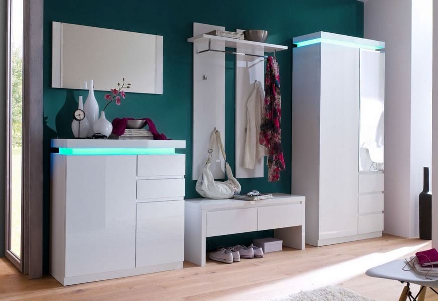 W skład zestawu wchodzą: szafa garderobiana, panel ścienny, lustro, komoda i ławka.