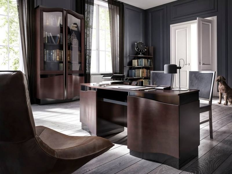 Piękne biurko z kolekcji Diuna, które wraz z kilkoma elementami: podwójną wysoką witryną ze szkłem, komodą i niskim stolikiem z pufami nadaje się idealnie do umeblowania reprezentacyjnego gabinetu czy kancelarii.