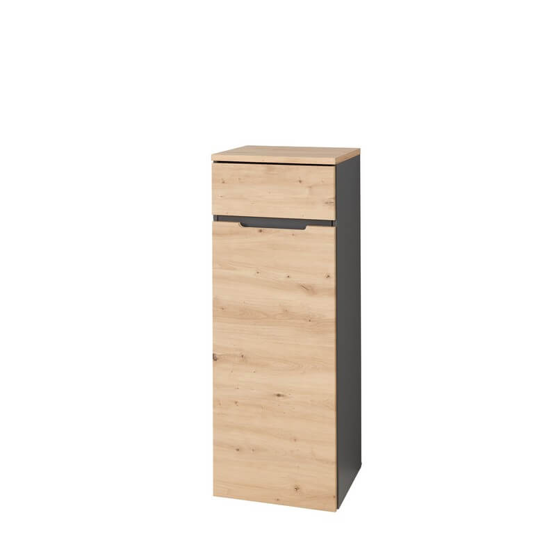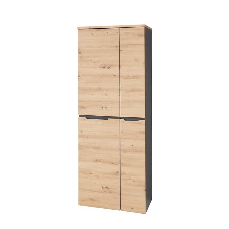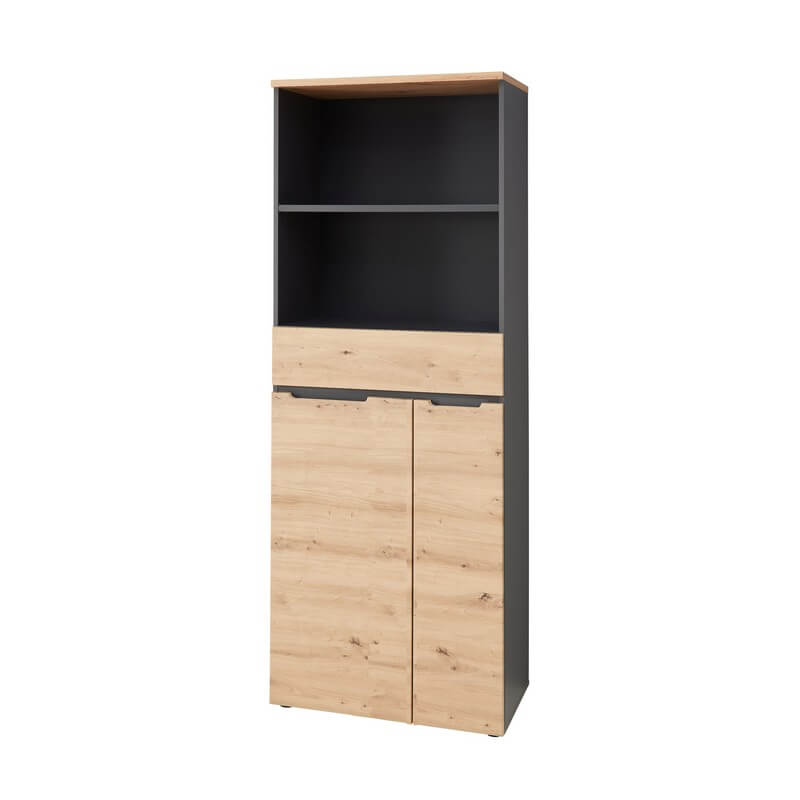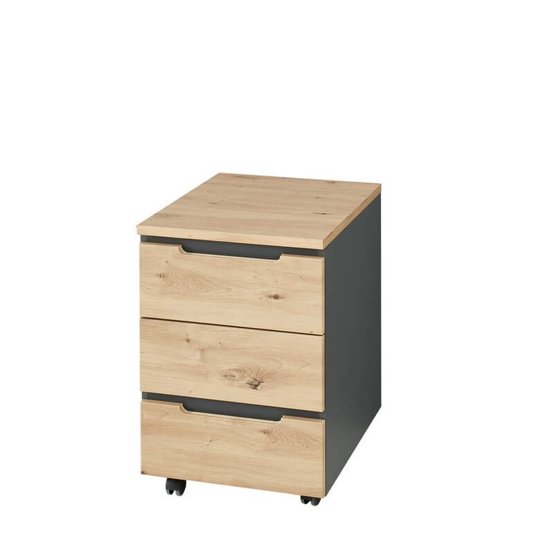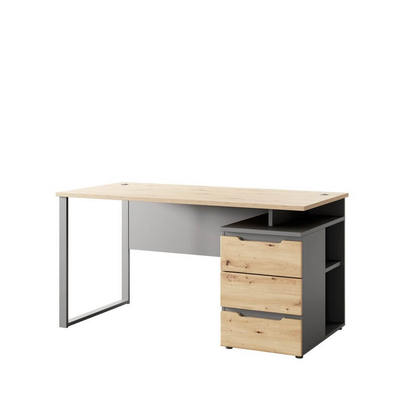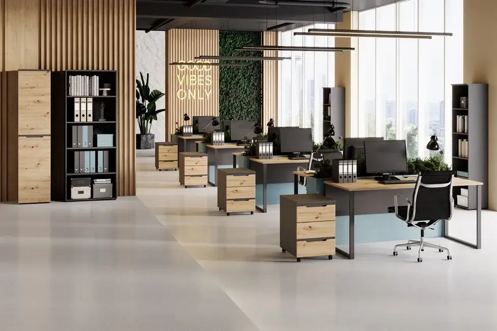 Kolekcja Brego zachwyca również elegancką kolorystyką – dąb artisan w połączeniu z grafitem nadaje wnętrzu nowoczesnego charakteru, jednocześnie wprowadzając przyjemną, ciepłą atmosferę. System cichego domyku, zastosowany w szafach i szafkach, zapewnia dodatkowy komfort użytkowania oraz chroni meble przed szybkim zużyciem. Przemyślane rozwiązania konstrukcyjne sprawiają, że każdy element kolekcji Brego jest praktyczny i trwały, gotowy sprostać wymaganiom intensywnej pracy biurowej.