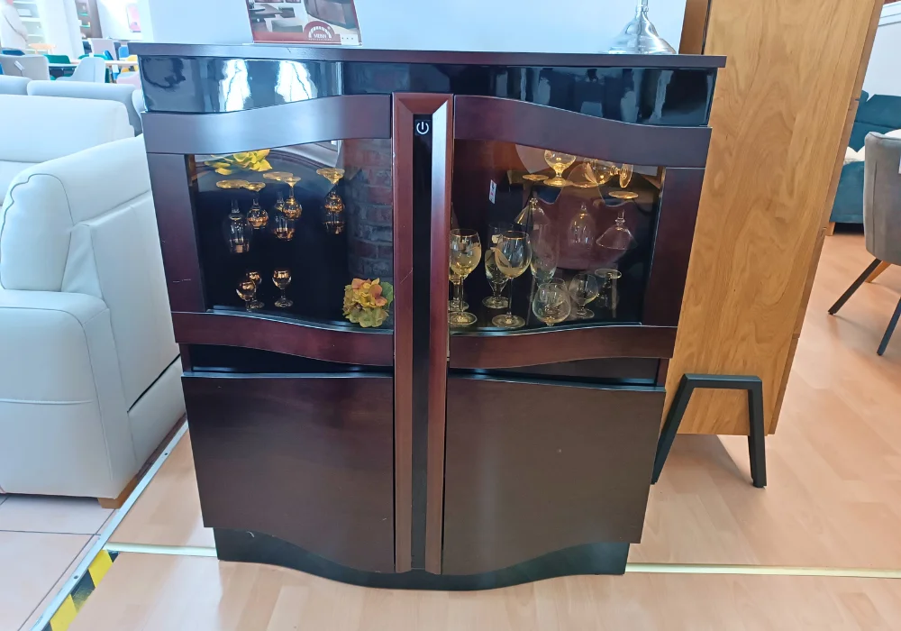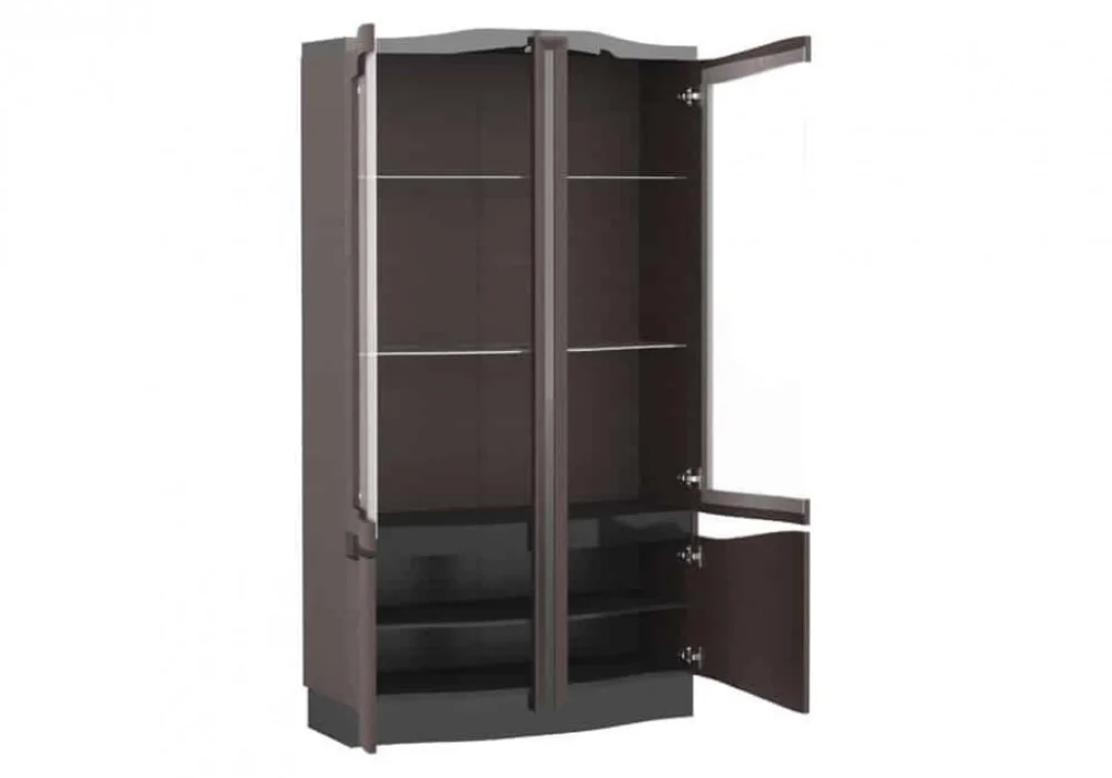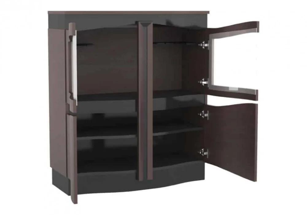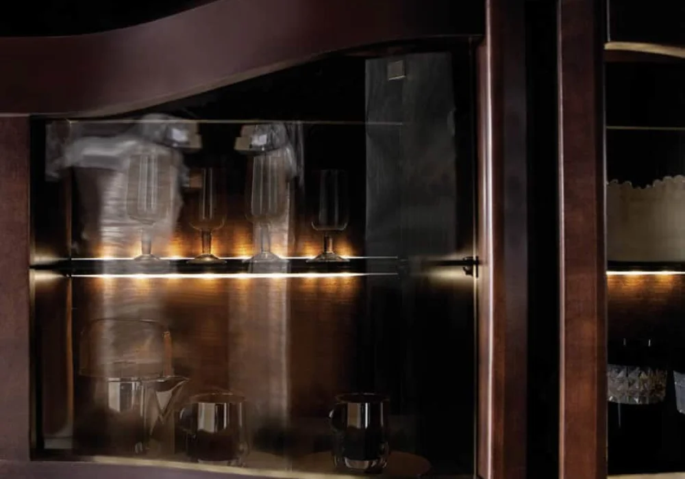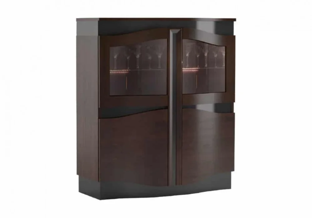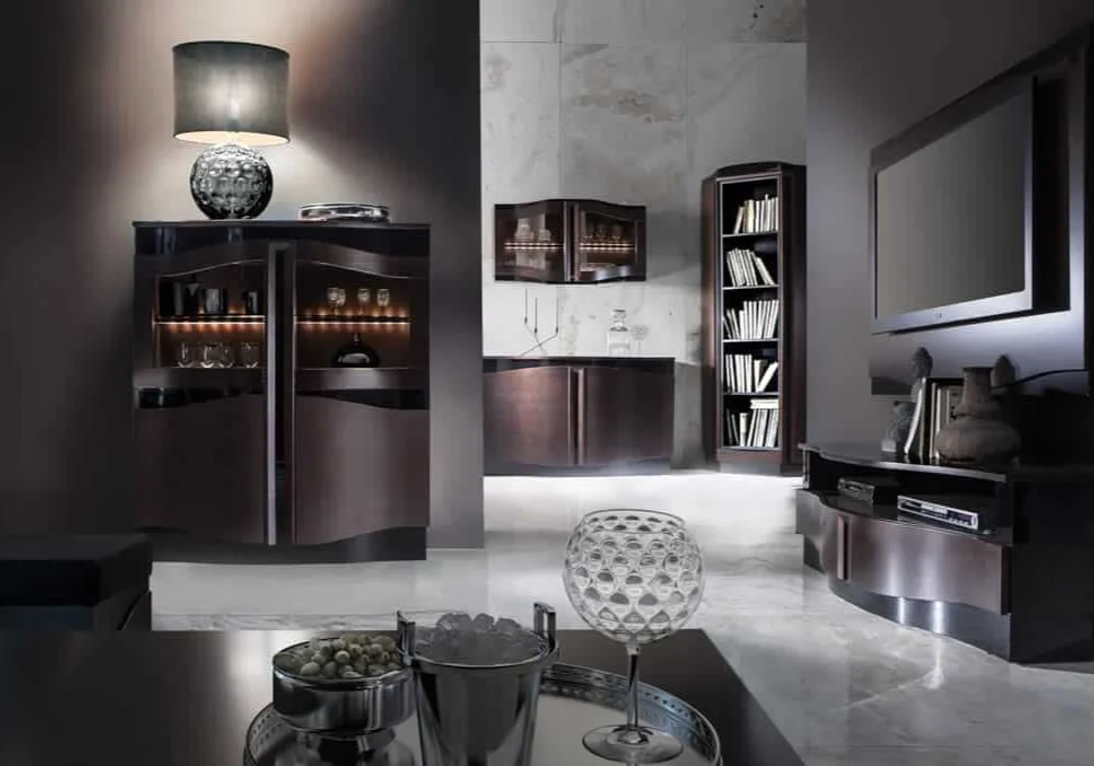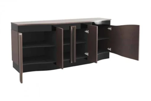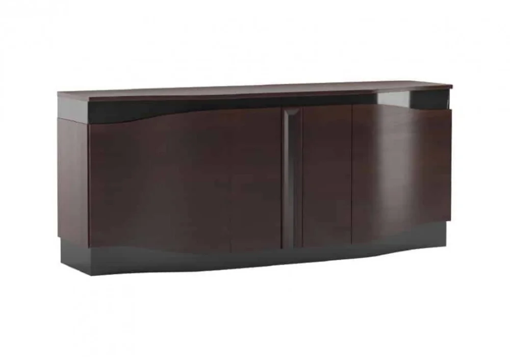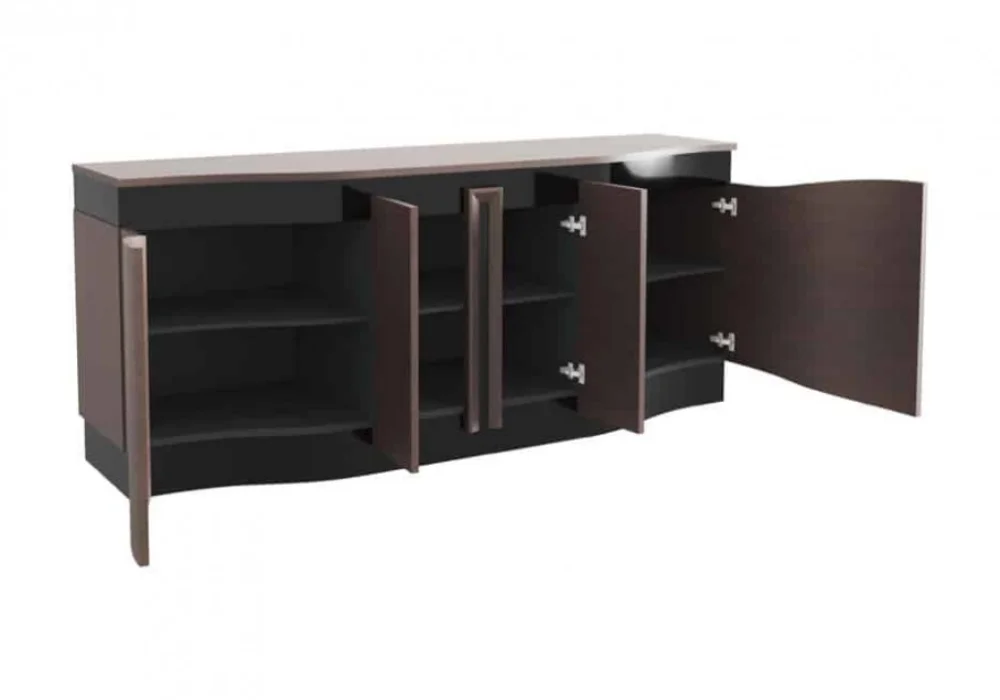 Efekt miękkich kształtów został spotęgowany kontrastowym zestawieniem barw – głęboka tonacja venge w połączeniu z połyskiem czarnych, lakierowanych wstawek tworzy wysmakowaną kompozycję kolorystyczną. Wzór inspirowany falą subtelnie podkreśla płynność brył i dodaje im lekkości.