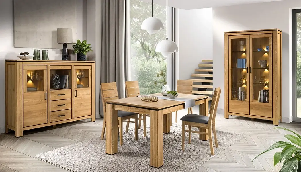 Kolekcja Faro II to wyjątkowe połączenie solidności i estetyki. Perfekcyjna dbałość o detale oraz imponująca jakość wykonania sprawiają, że te meble są prawdziwą ozdobą każdego wnętrza. Wykonane z masywnego drewna dębowego, prezentują się niezwykle okazale i przykuwają uwagę każdego gościa.