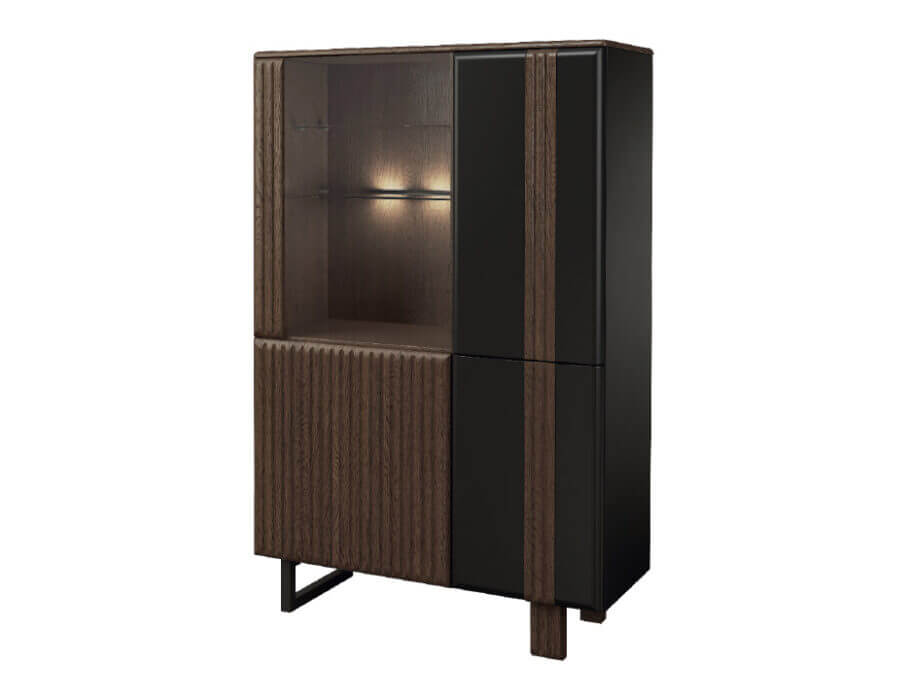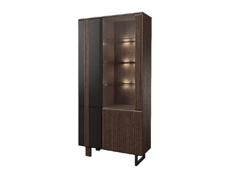 Za przyciemnionymi szybami kryją się cenne przedmioty, subtelnie oświetlone delikatnym światłem LED, co tworzy wyjątkowo dekoracyjny efekt. Oświetlenie zamontowane na tylnych krawędziach szklanych półek dodaje meblom unikalnego charakteru.