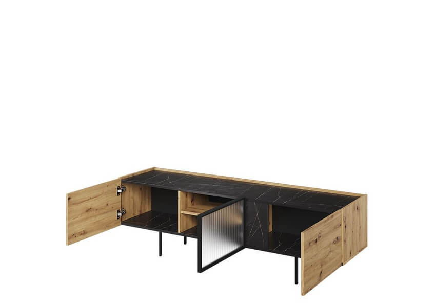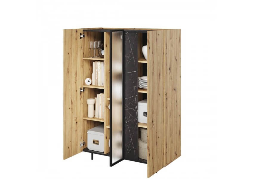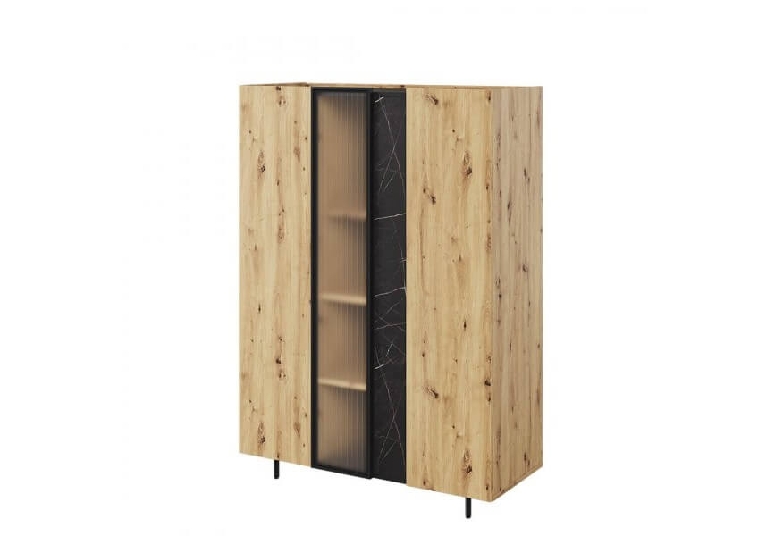 Naturalny odcień drewna, marmurowe detale i subtelne czarne akcenty pozwalają na stworzenie aranżacji o ponadczasowym charakterze. Dzięki połączeniu szkła ornamentowego, metalowych nóżek i marmurowych dekorów, meble z tej kolekcji wprowadzają do wnętrza nutę nowoczesnej elegancji i wyrazistego stylu.