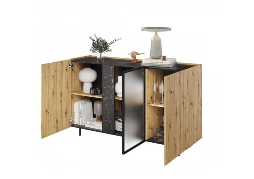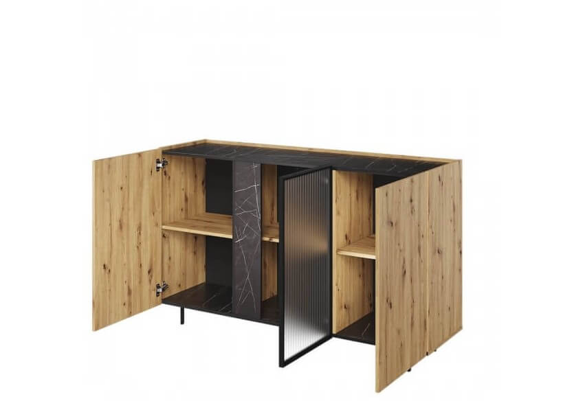 Komoda 3-drzwiowa o długości 150 cm Marmo to niezwykle pojemny mebel, który pomoże utrzymać porządek wśród różnych akcesoriów. Jej wnętrze skrywa przestronne półki, które zapewnią dużo miejsca na przechowywanie. Komoda została zaprojektowana z myślą o praktyczności – obniżony blat chroni przed przypadkowym przewróceniem się wyeksponowanych przedmiotów.