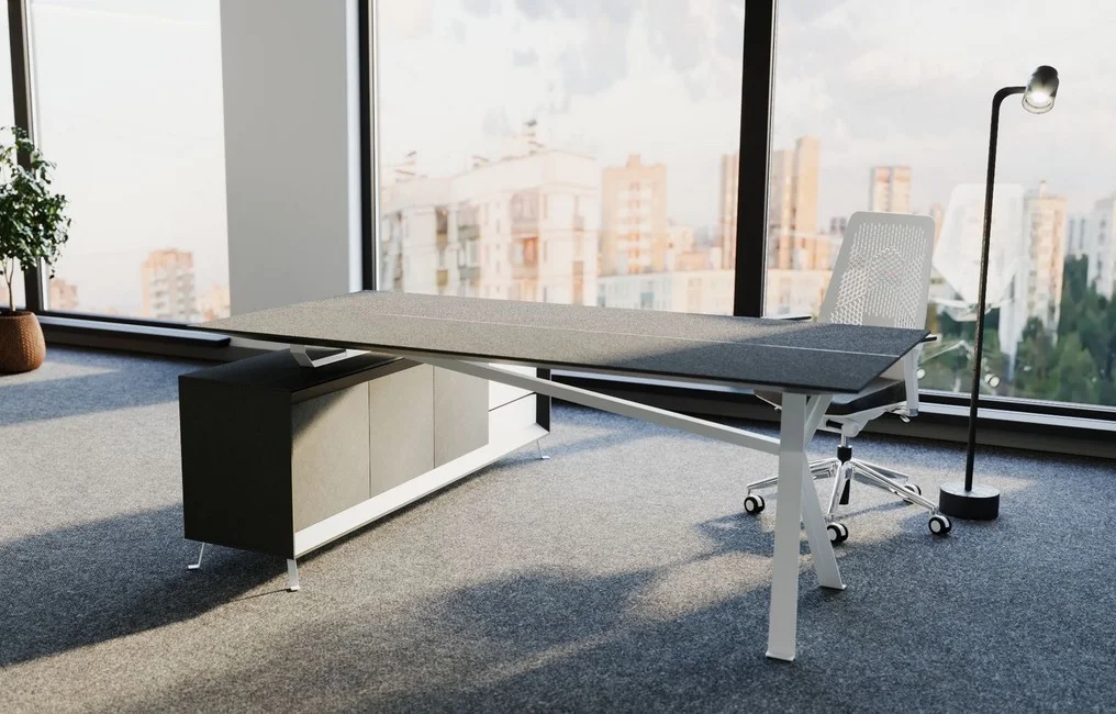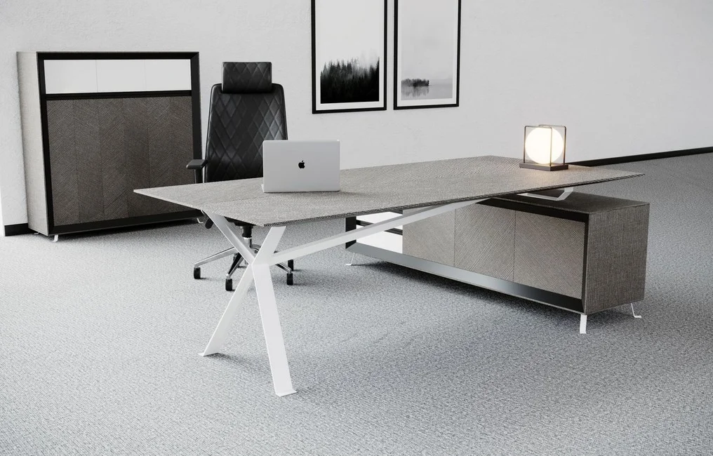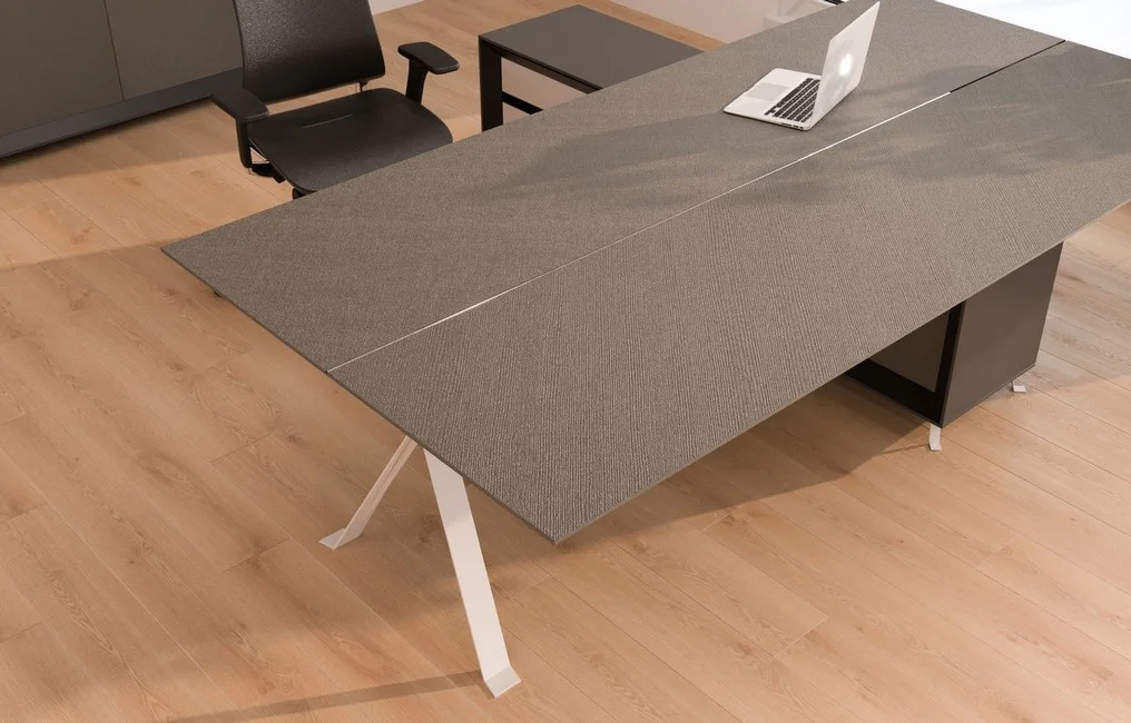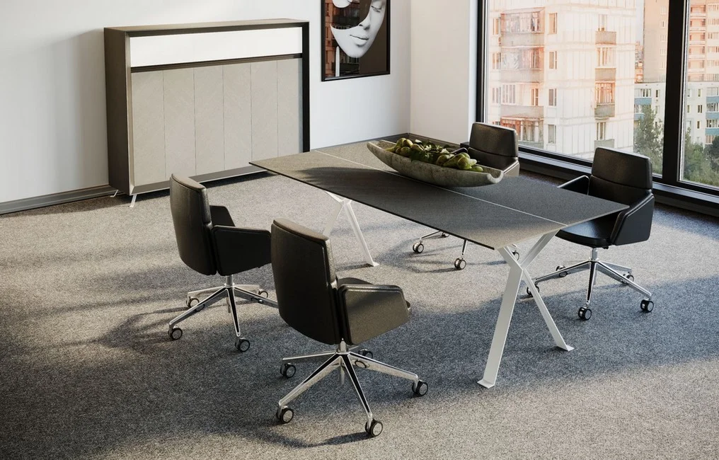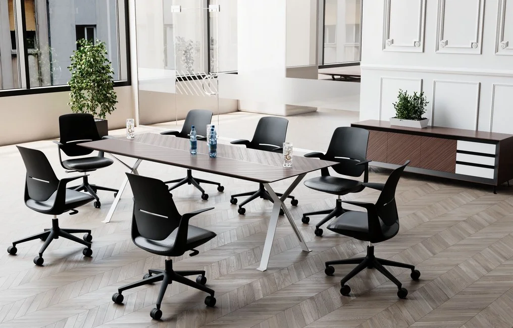 Dzięki solidnej metalowej ramie zapewniającej stabilność i trwałość, meble Chevron są nie tylko imponujące wizualnie, ale także trwałe. Zastosowanie teksturowanej płyty Spigato na stole konferencyjnym uzupełnia ogólny wyrafinowany styl, tworząc profesjonalną i zachęcającą przestrzeń roboczą.