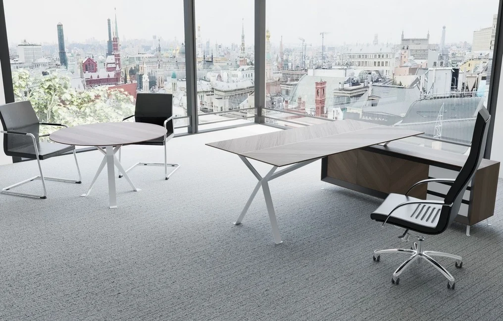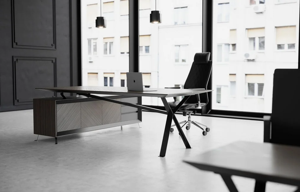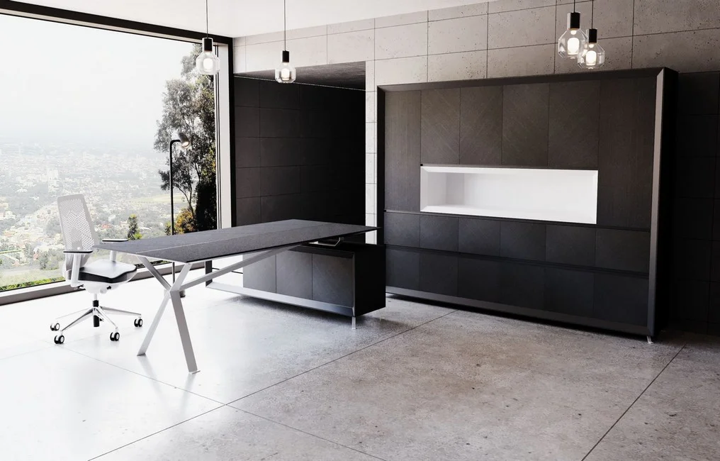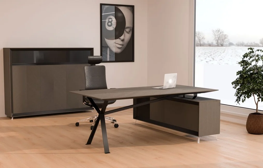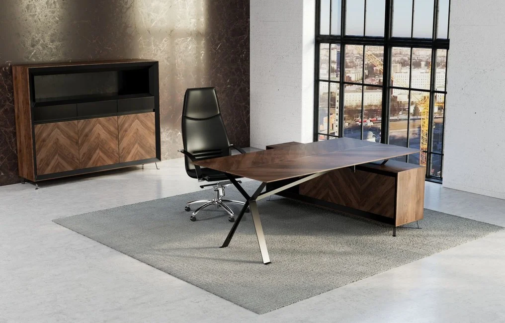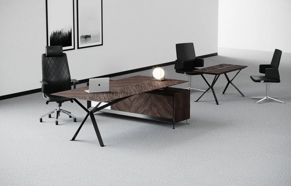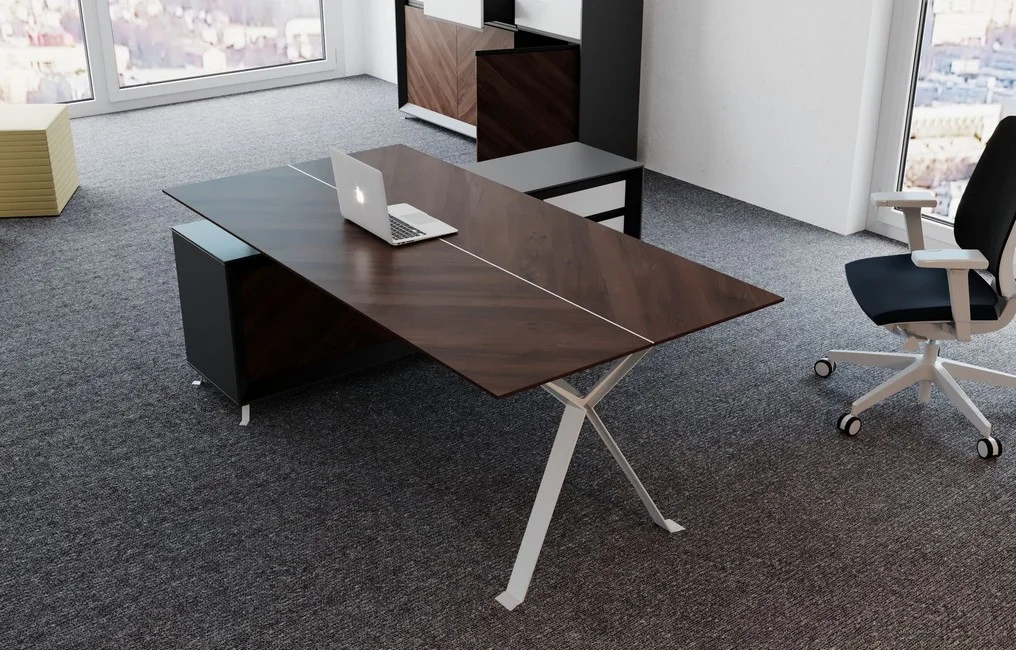 Meble Chevron dostępne są również w wersji z okleiną naturalną, zachowując przy tym swój indywidualny styl, który, połączony z ciemnym stelażem, wnosi do gabinetu elegancję i prestiż.