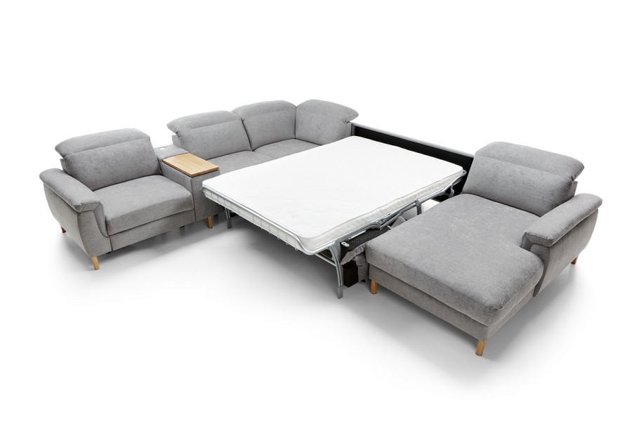 Miękkie oparcia i głębokie siedziska to kluczowe cechy mebli z kolekcji Mia. Dzięki nim, siedząc na nich, można zanurzyć się w wyjątkowy komfort i odpocząć po ciężkim dniu. Ale to nie wszystko, model został wyposażony w wiele nowoczesnych funkcji, które podnoszą wygodę użytkowania: 2 x elektryczna funkcja relaks i zabudowanym podnóżkiem, komputerową półkę z pojemnikiem z USB i gniazdkiem sieciowym, funkcja spania typu włoskiego o pow. spania 140×200 cm, pojemnik na pościel.
