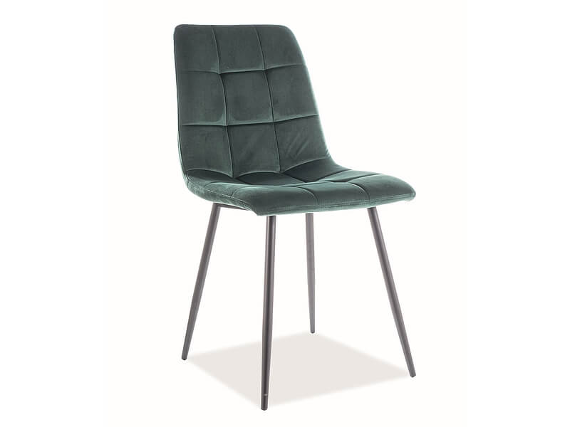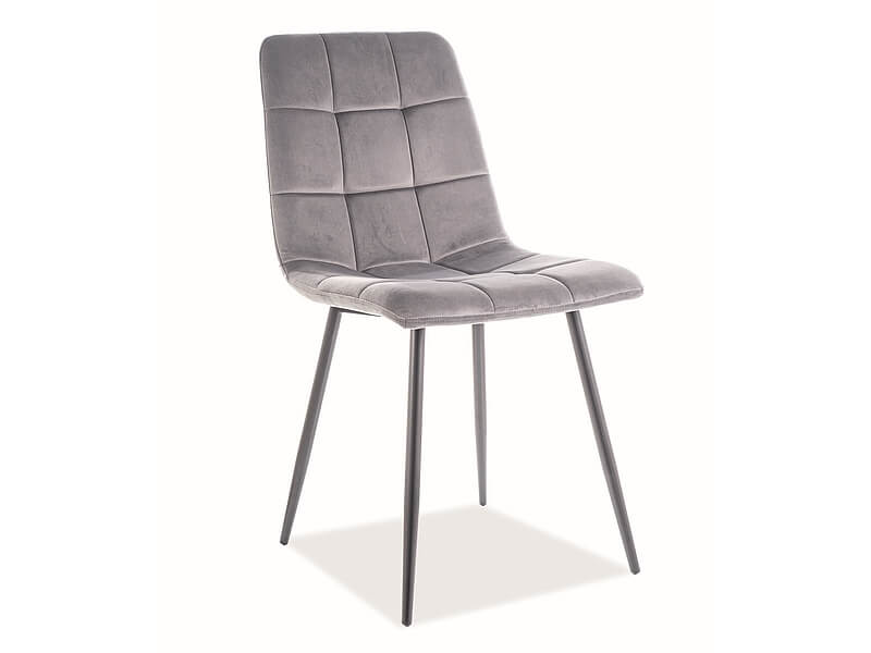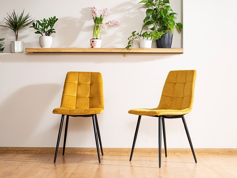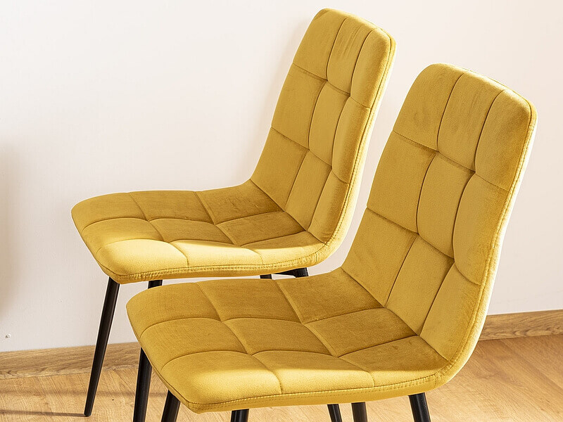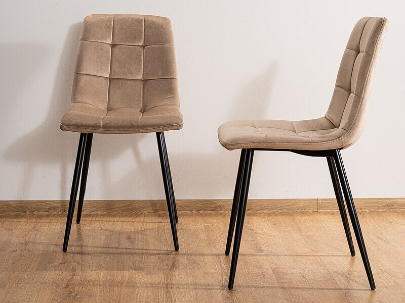 Wygodne siedzisko osadzone jest na metalowych nogach w modnym kolorze czarny mat. Elegancji i uroku dodają delikatne pikowania na oparciu. Krzesło doskonale sprawdzi się w aranżacji salonu,
