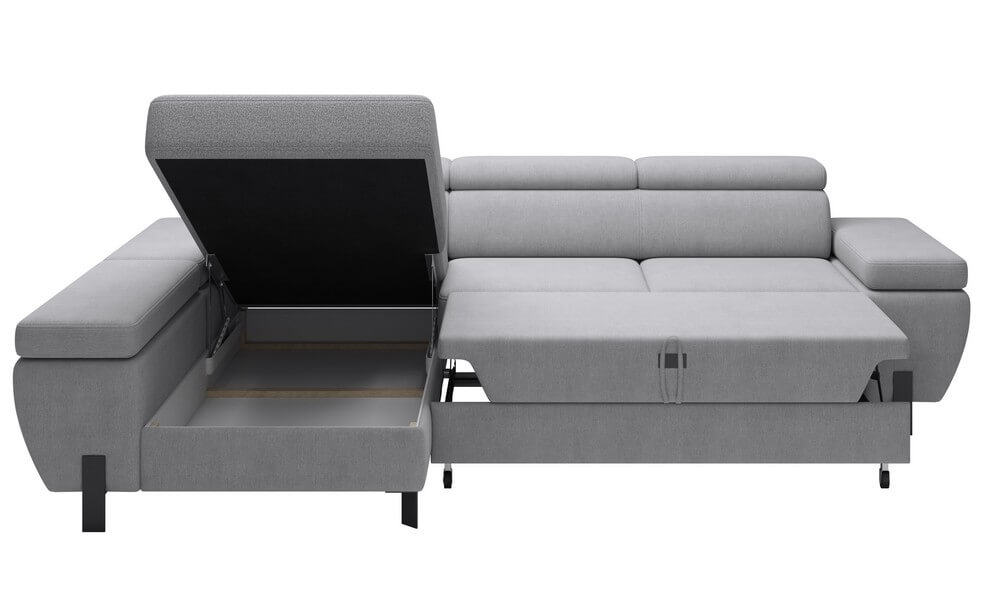 Funkcjonalny narożnik Molina Mini posiada regulowane zagłówki i wyposażony jest w funkcję spania o powierzchni 125×210 cm oraz pojemnik na pościel. Oryginalne, metalowe nóżki podkreślają wyjątkowy charakter mebla. Komfortowe oparcia z regulowanymi zagłówkami oraz ruchomy podłokietnik sprawią, że każdy z domowników będzie mógł wypoczywać tak jak lubi.