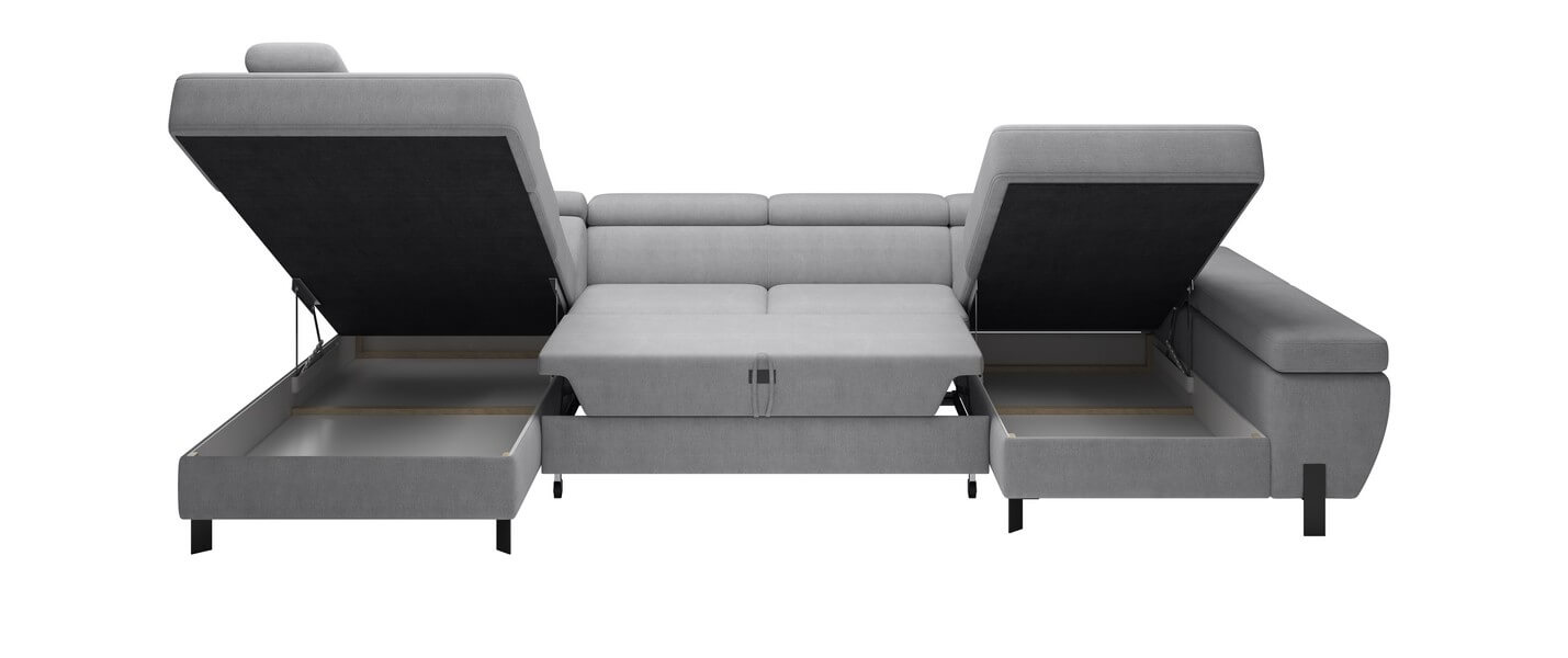 Molina XL to luksusowy narożnik, który posiada funkcję relaks – regulowane zagłówki oraz podłokietniki. Wyposażony jest w funkcję spania o powierzchni 124×265 cm oraz dwa pojemniki na pościel. Oryginalne, metalowe nóżki podkreślają wyjątkowy charakter mebla.