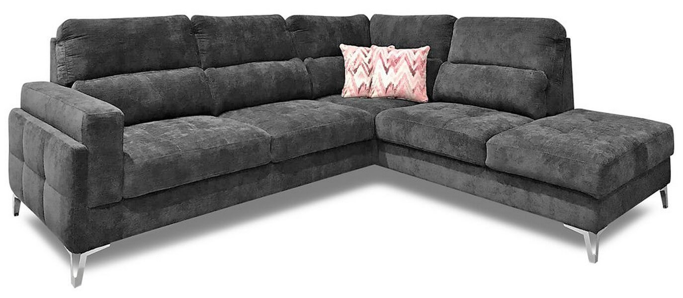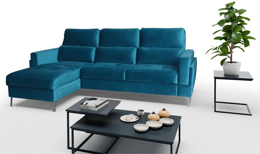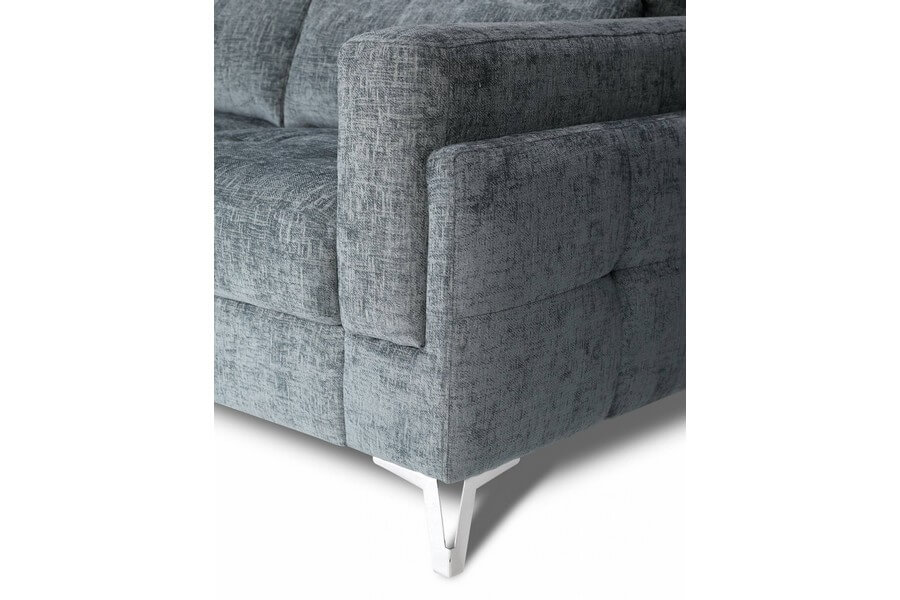 Posiada wygodne oparcie i podłokietnik pozwalający wygodnie oprzeć się bokiem. Narożnik wyróżnia solidna metalowa chromowana noga dostępna też w kolorze matowy czarny.