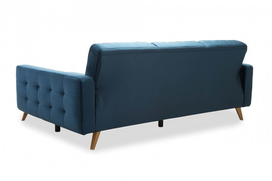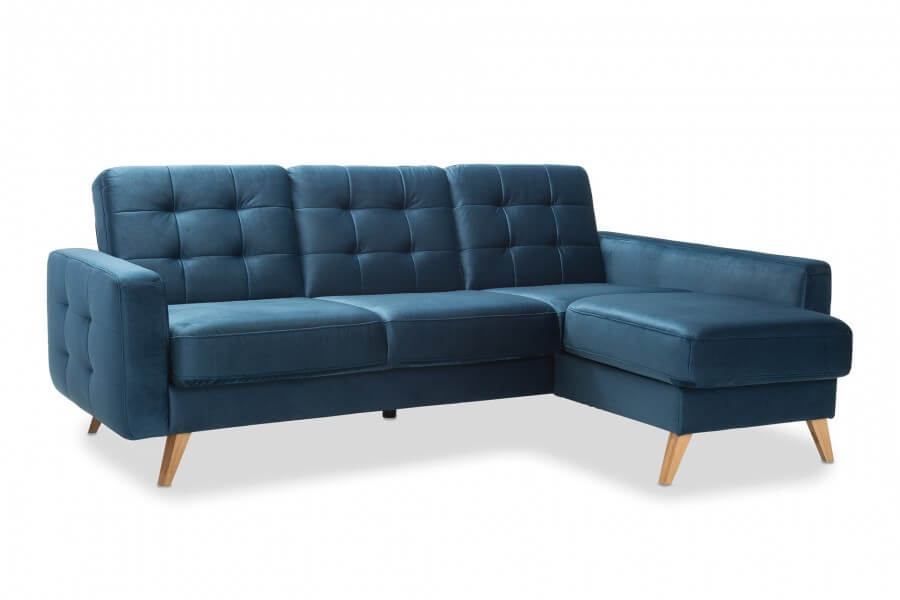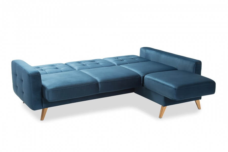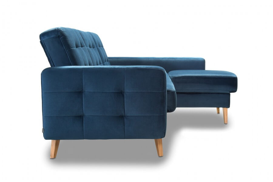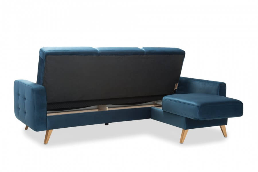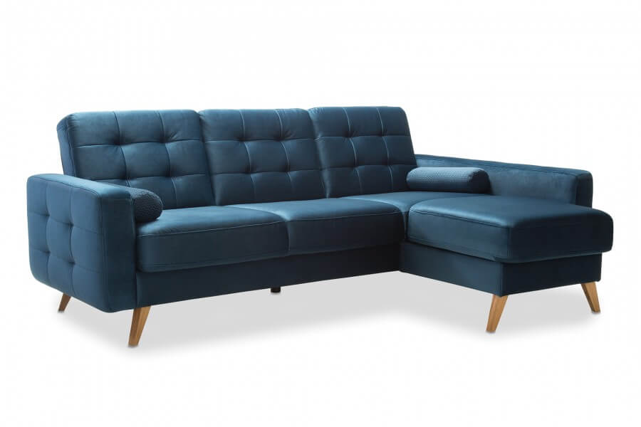 Narożnik wypoczynkowy z funkcją spania typu C.S.T. i pojemnikiem na pościel. Mebel nawiązuje designem do stylu skandynawskiego. Mebel ma wysokie, drewniane nóżki oraz geometryczne przeszycia na bokach i oparciu.