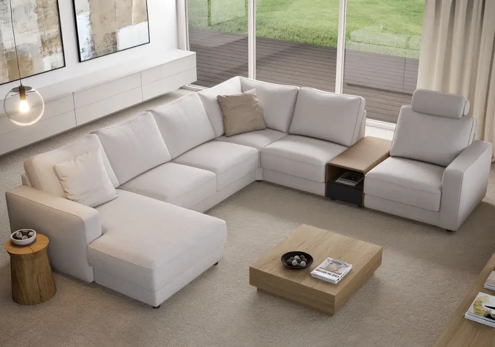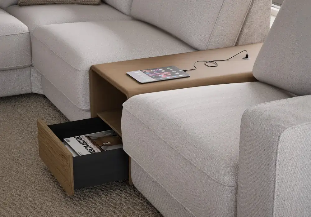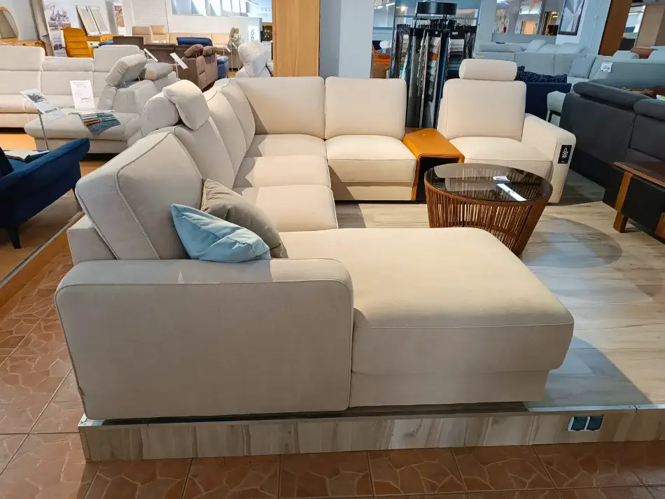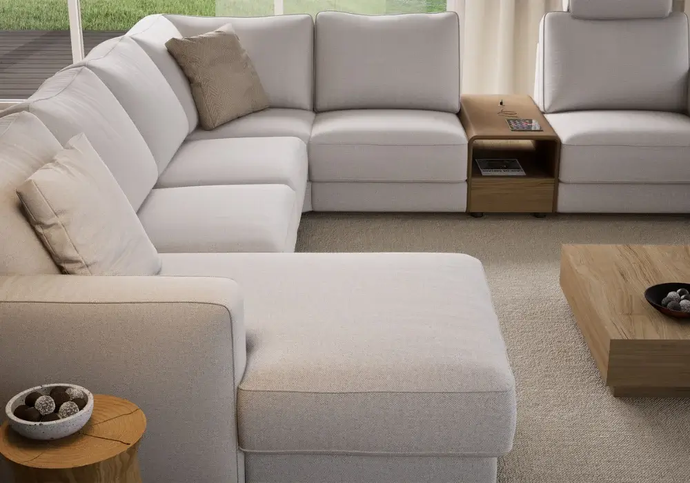 Narożnik został dodatkowo wyposażony w moduł z wysuwaną szufladą oraz portem USB wykonanym ze skóry naturalnej, co sprawia, że jest nie tylko praktyczny, ale także stylowy. Funkcja spania typu Puma o wymiarach 140×200 czyni go idealnym miejscem do noclegu dla gości, a dodatkowy pojemnik na pościel sprawia, że utrzymanie porządku w salonie staje się łatwiejsze.