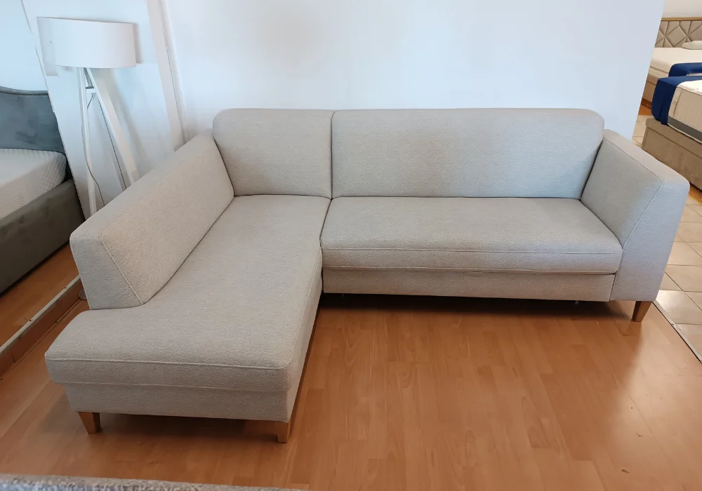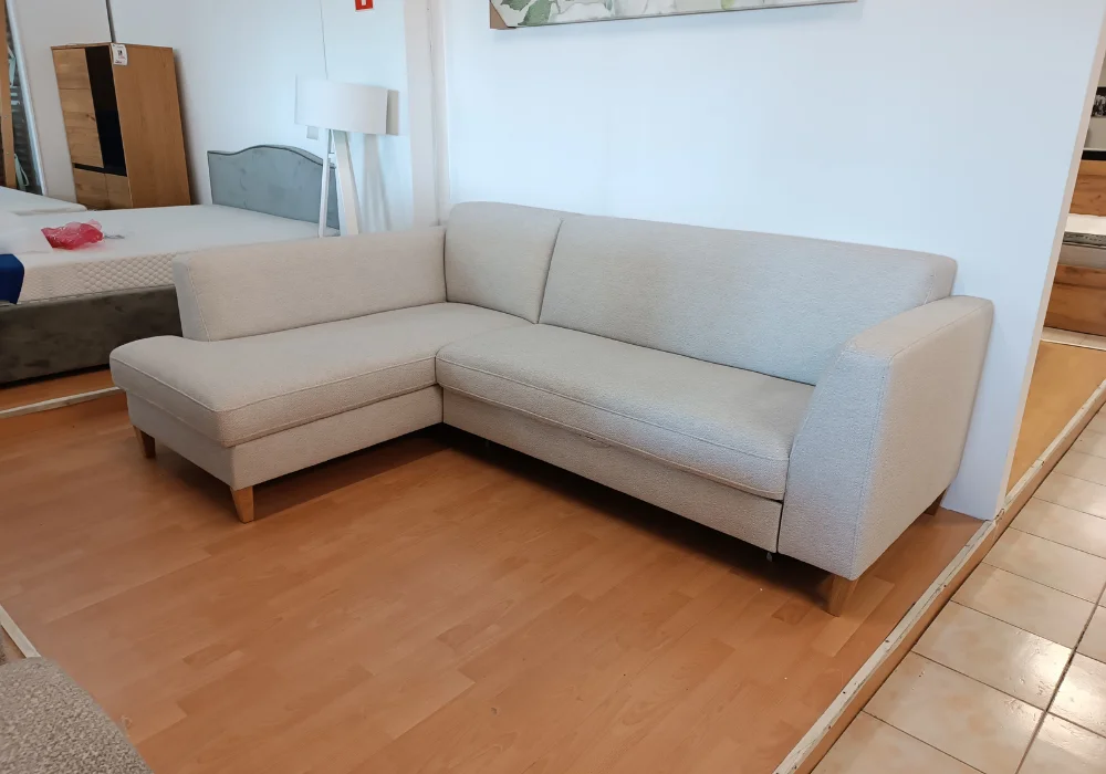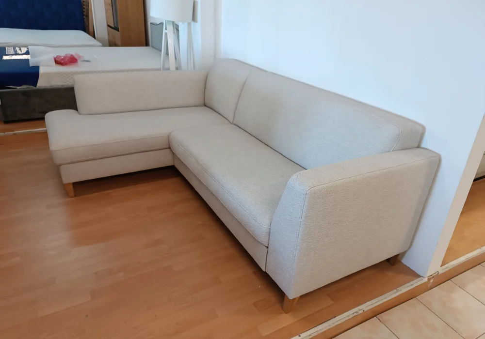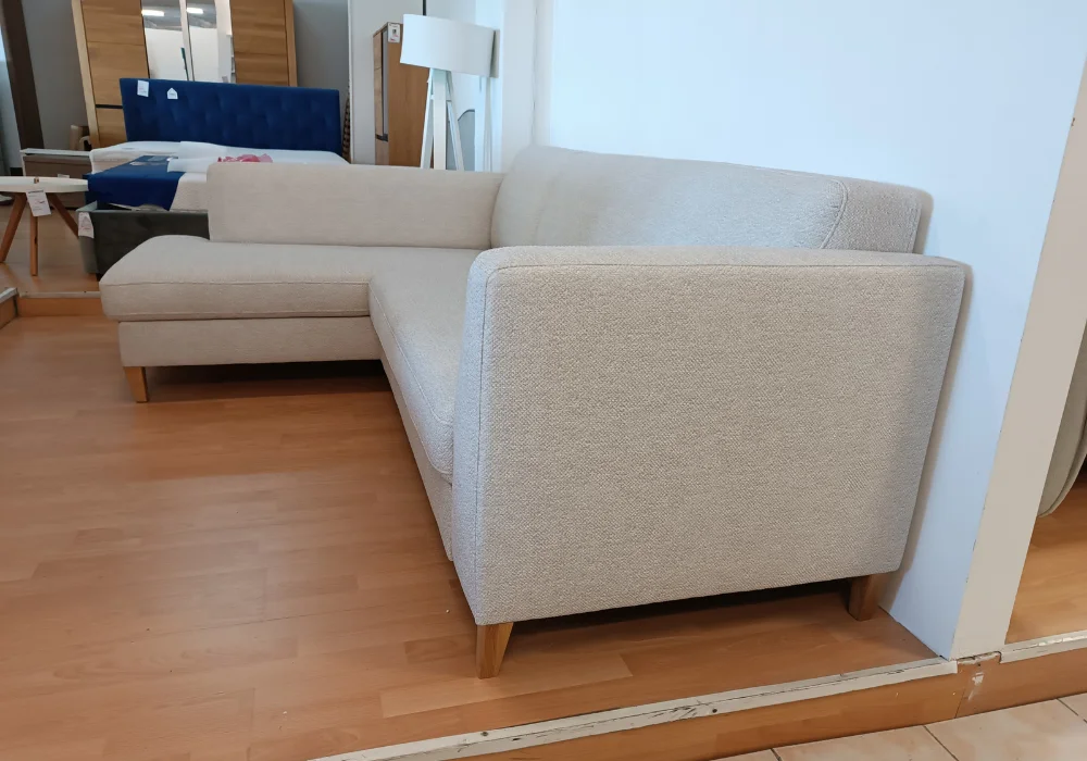 Mimo kompaktowych gabarytów, narożnik oferuje pełną wygodę – doskonale sprawdza się nawet w mniejszych pomieszczeniach, zachowując elegancki i lekki wygląd dzięki wysokim drewnianym nóżkom.